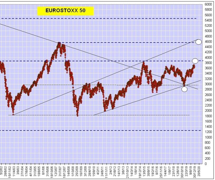 Sull’indice Eurostxx50 possiamo già identificare gli ESTREMI INFERIORI e SUPERIORI, rispettivamente a 3500 punti e a 3800 punti. Nel 2020, qualora avvenisse la rottura dei MASSIMI del 2015 (poco sopra i 3800 punti), avremmo una PROIEZIONE di PREZZO a 4600 punti.
