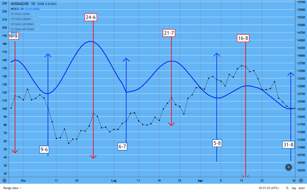Notate inoltre che la salita del NASDAQ tra Giugno e Agosto è stata accompagnata dalla LINEA VERDE del CICLO SOLE-URANO.