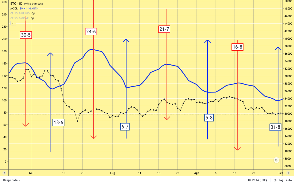 Qui sotto vediamo anche l’ONDA dei MINICICLI anche su BITCOIN (il prolungamento dell’ONDA è visibile per gli ABBONATI).