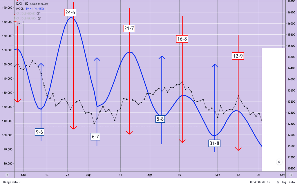 Il NASDAQ ha reagito abbastanza bene in Giugno sulle CONGIUNZIONI MARTE-NETTUNO e MARTE-GIOVE (avvenute in Maggio), ma al momento la tendenza non si è ancora manifestata completamente in senso ascendente (ci troviamo cioè in una fase di ritracciamento dopo la ripartenza di Giugno e i massimi di metà Agosto).