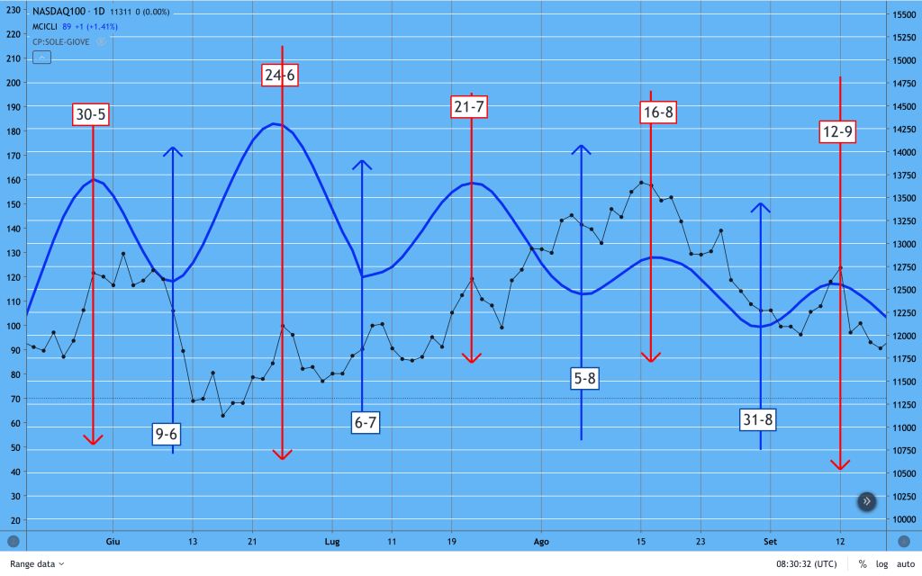 Qui sotto vediamo l’andamento dei CICLI di MARTE sul NASDAQ (time frame settimanale).