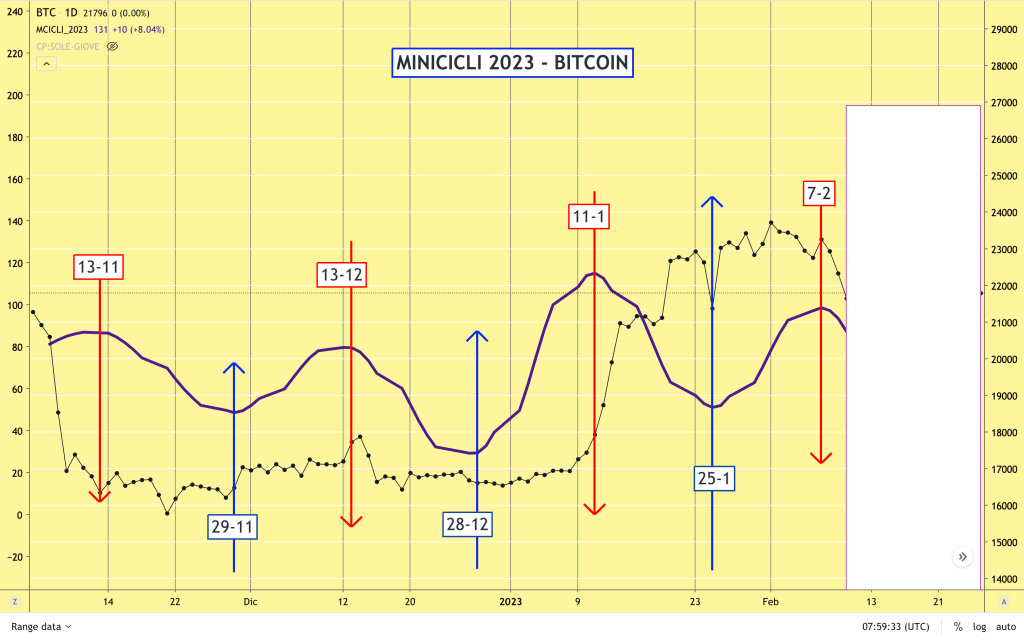 Dal punto di vista dell’ONDA dei MINICICLI (versione 2023) è confortante constatare che BITCOIN ed ETHEREUM hanno mostrato una buona correlazione ed un buon impatto visivo nell’inversione del 7 Febbraio.