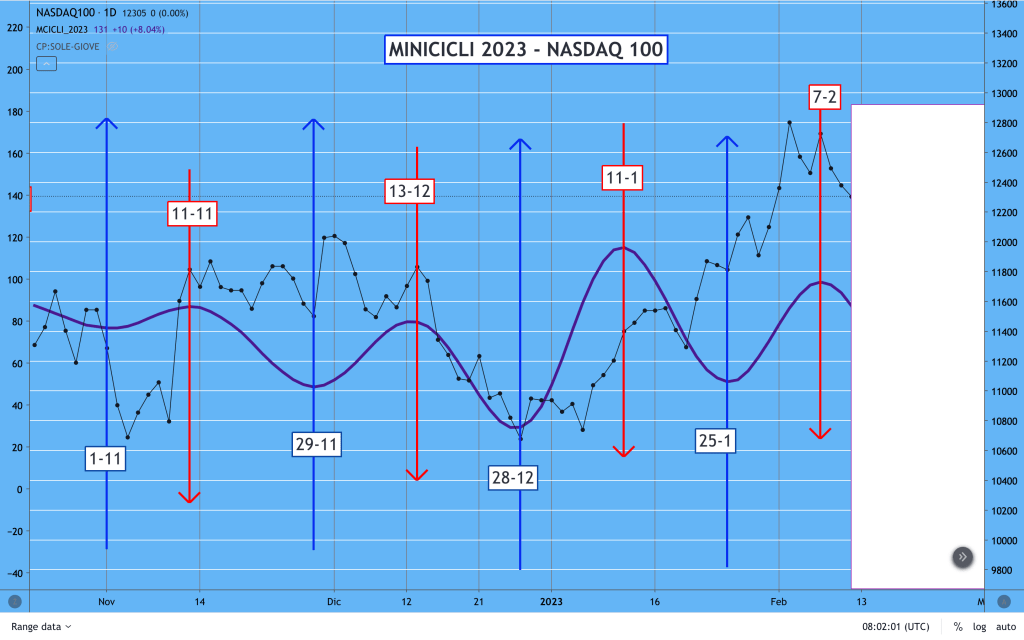 L’orientamento, come spiegato nell’ultima coaching, è di tenere come riferimento la VERSIONE MINICICLI 2023, che presentava un’ONDA al RIALZO dal 25 Gennaio al 7 Febbraio.