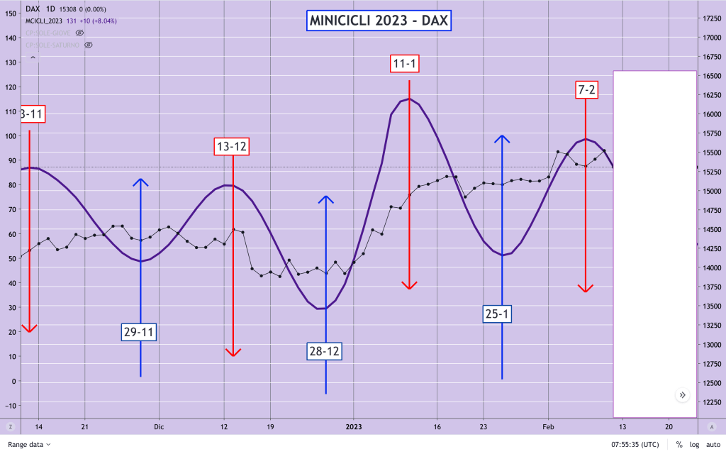 L’ONDA al RIBASSO dei MINICICLI è appena iniziata (qui sotto sul DAX) e terminerà indicativamente il ….