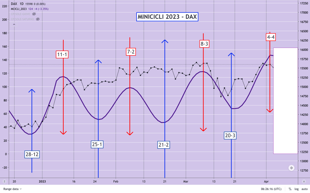 Ricordo infatti, a beneficio di tutti, che nonostante il RITMO RIALZO-RIBASSO dei MINICICLI, a mio parere la tendenza di fondo, partita a fine Settembre 2022, è rialzista anche per i prossimi mesi (almeno fino a Maggio – inizio Giugno), per cui mi aspetterei nuovi massimi su MIB e DAX (non sto parlando dell’immediato ma in prospettiva).
