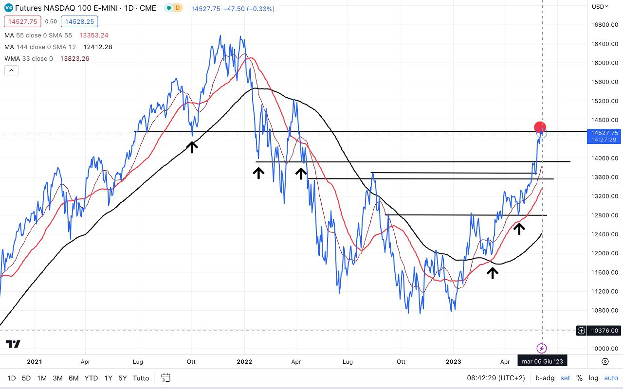 Il NASDAQ 100, in ogni caso, si trova attorno alla RESISTENZA che avevamo individuato attorno ai 14600 punti.
