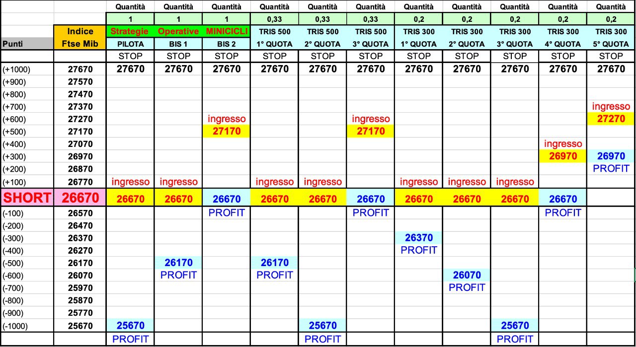 E’ scattato, in ogni caso, l’ingresso SHORT del BIS a 27170 punti, per cui se si tornerà a 26670 scatterà automaticamente anche il take profit di 500 punti.