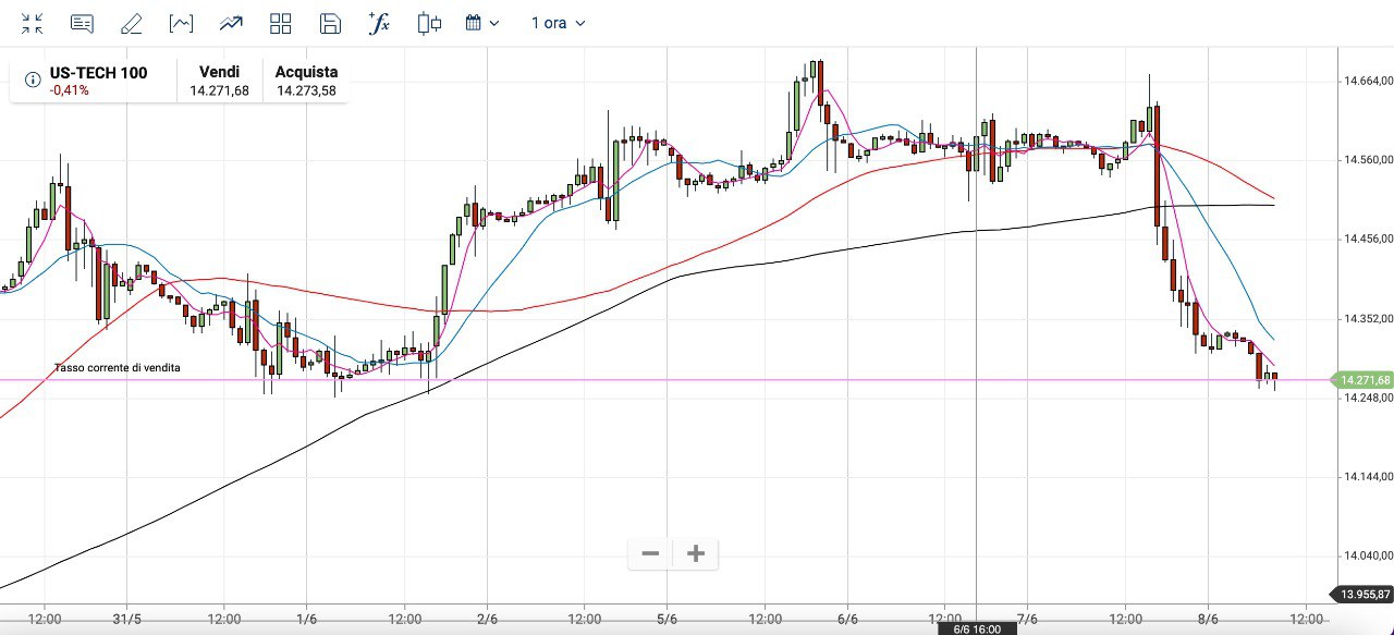 Dai massimi di ieri pomeriggio poco sotto i 14700 punti il NASDAQ 100 è sceso di circa 400 punti e si trova ora attorno ai 14275 punti.