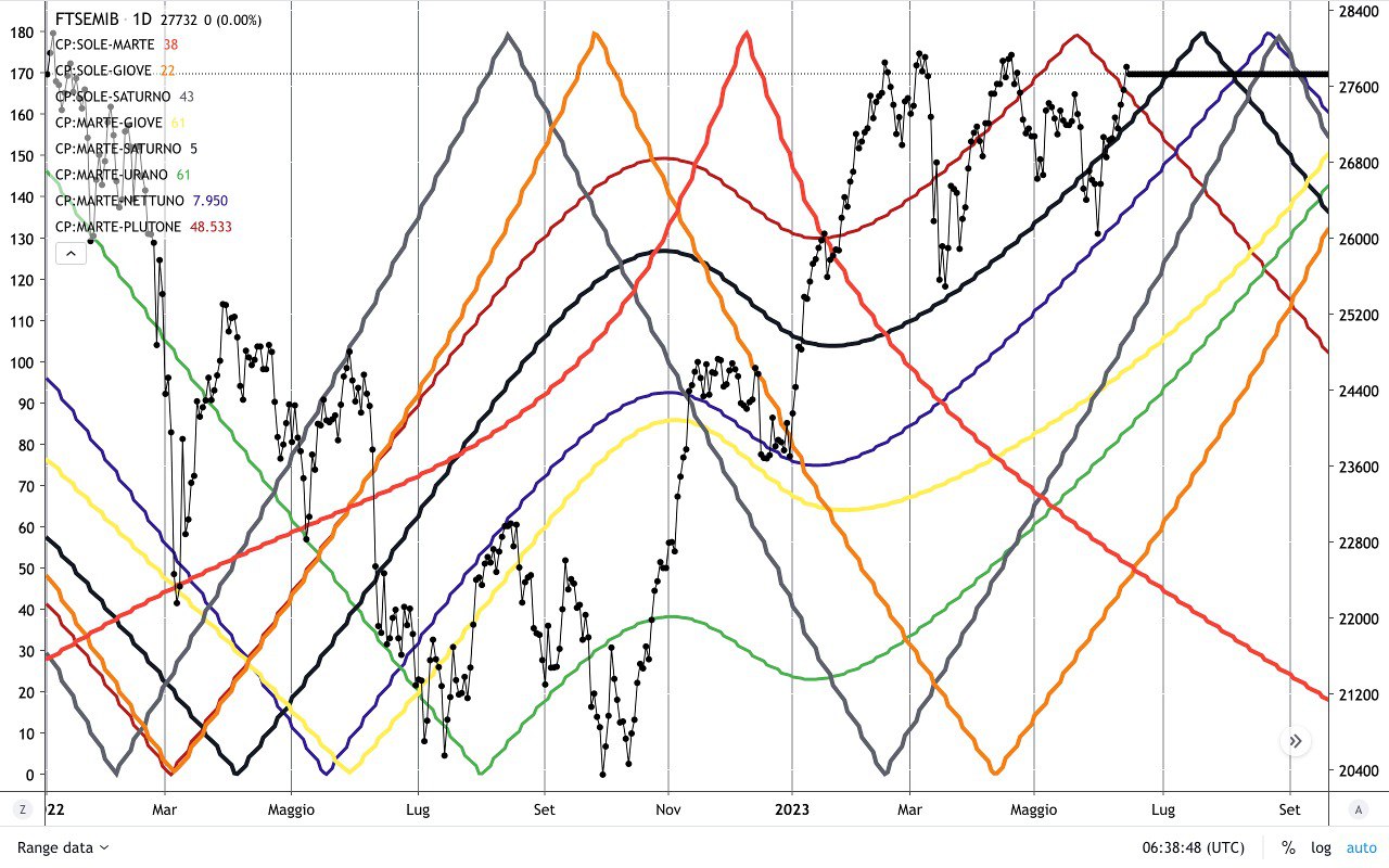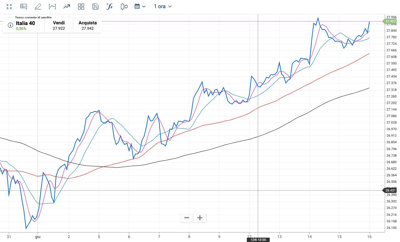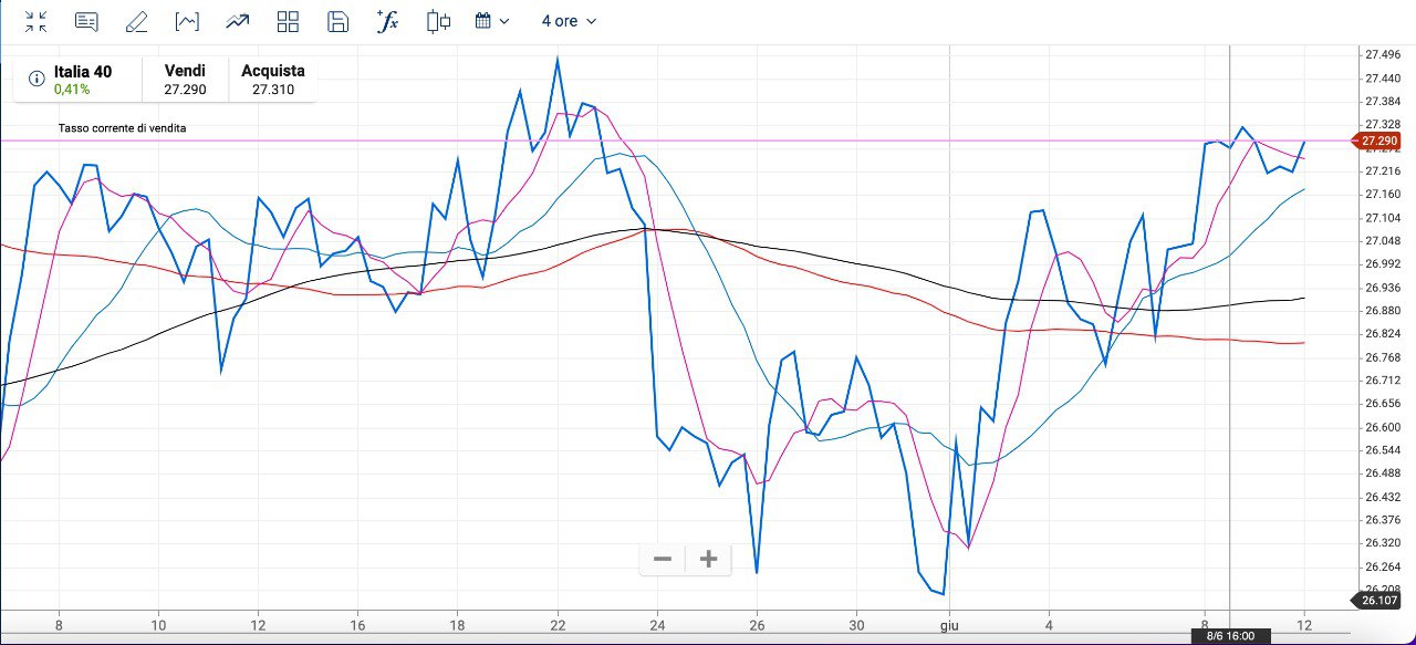 Nel grafico vediamo l’ascesa del nostro indice dopo il minimo di fine Maggio, dai 26000 punti ai quasi 28000 punti attuali.
