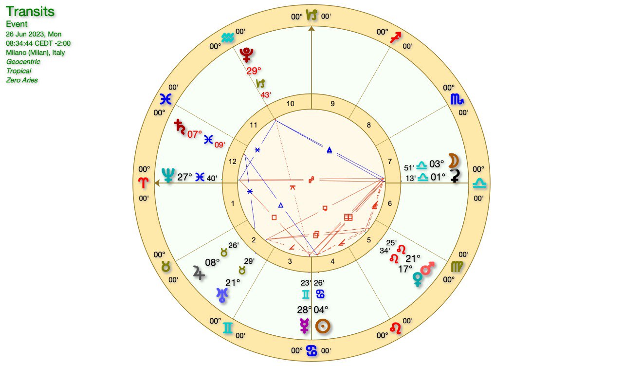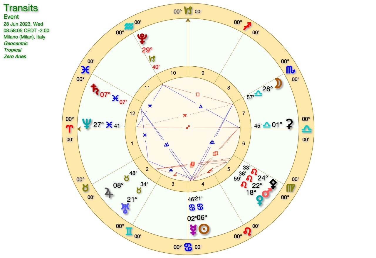 La LUNA si trova alla fine della BILANCIA, in procinto di entrare in SCORPIONE, in TRIGONO a MERCURIO-SOLE-SATURNO e in OPPOSIZIONE a GIOVE.