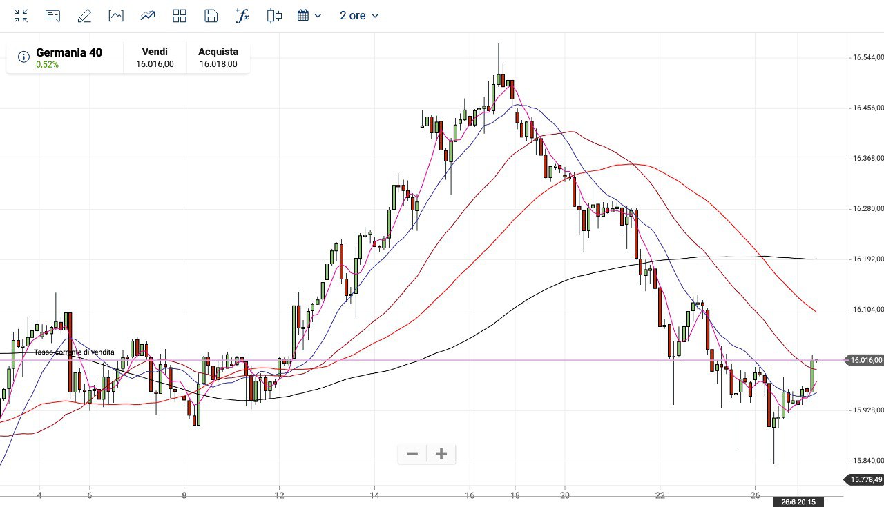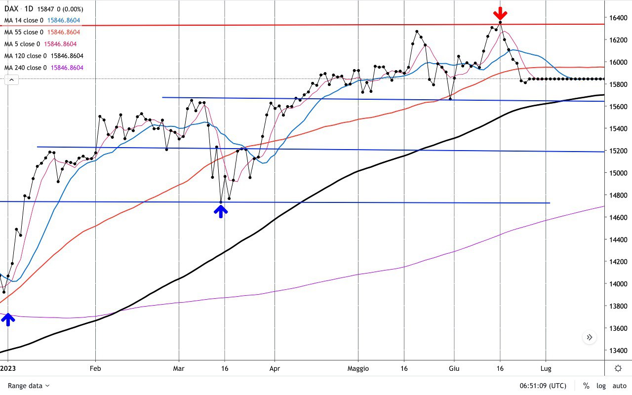 Il DAX, come vediamo sotto, è rimasto più stabile, ma è comunque risalito sulla soglia dei 16000 punti.