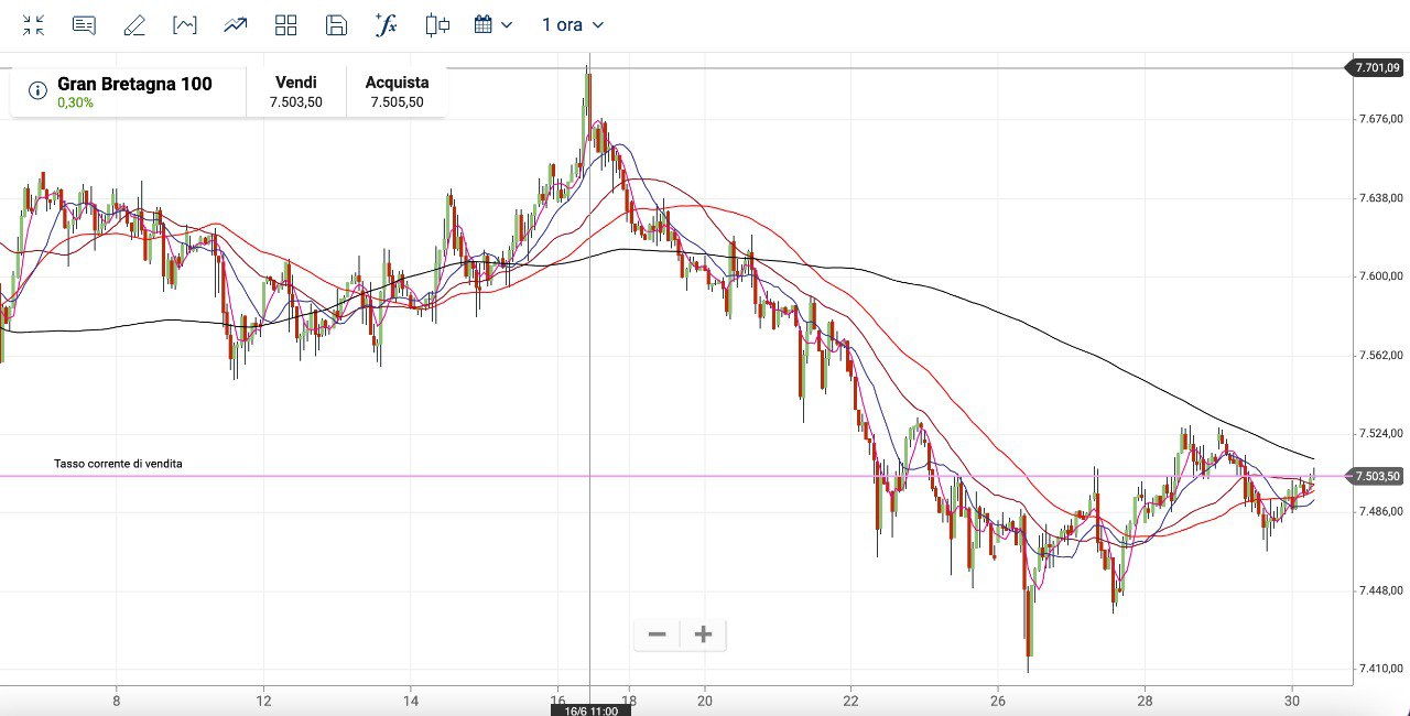 Qui sopra vi mostro il grafico del FTSE 100 inglese, che dal PICCO RIALZISTA del 16 Giugno, si è poi mosso al ribasso, passando dai 7700 punti ai 7400 del 26 Giugno, per risalire ora verso i 7500 punti circa.