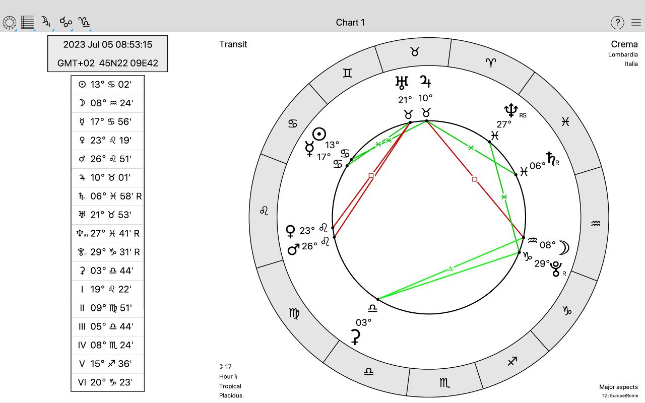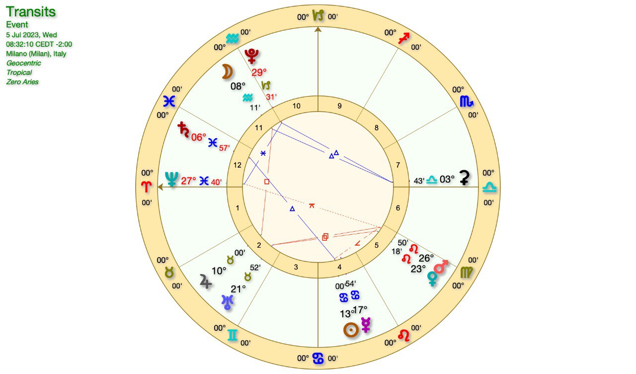 Oggi la LUNA è in PESCI e in CONGIUNZIONE a SATURNO (in SESTILE a GIOVE) ma ieri la LUNA era alla fine dell’ACQUARIO, esattamente in QUADRATURA a URANO in TORO e in OPPOSIZIONE a VENERE e MARTE in LEONE.