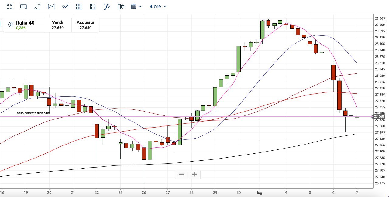 Il potenziale supporto che avevamo identificato attorno ai 27900 punti, dopo un breve rimbalzo, è stato rotto con forza al ribasso, dando quindi ragione all’analisi fatta ieri mattina che ipotizzava un movimento più ampio, e che in effetti ha toccato i 27500 punti.
