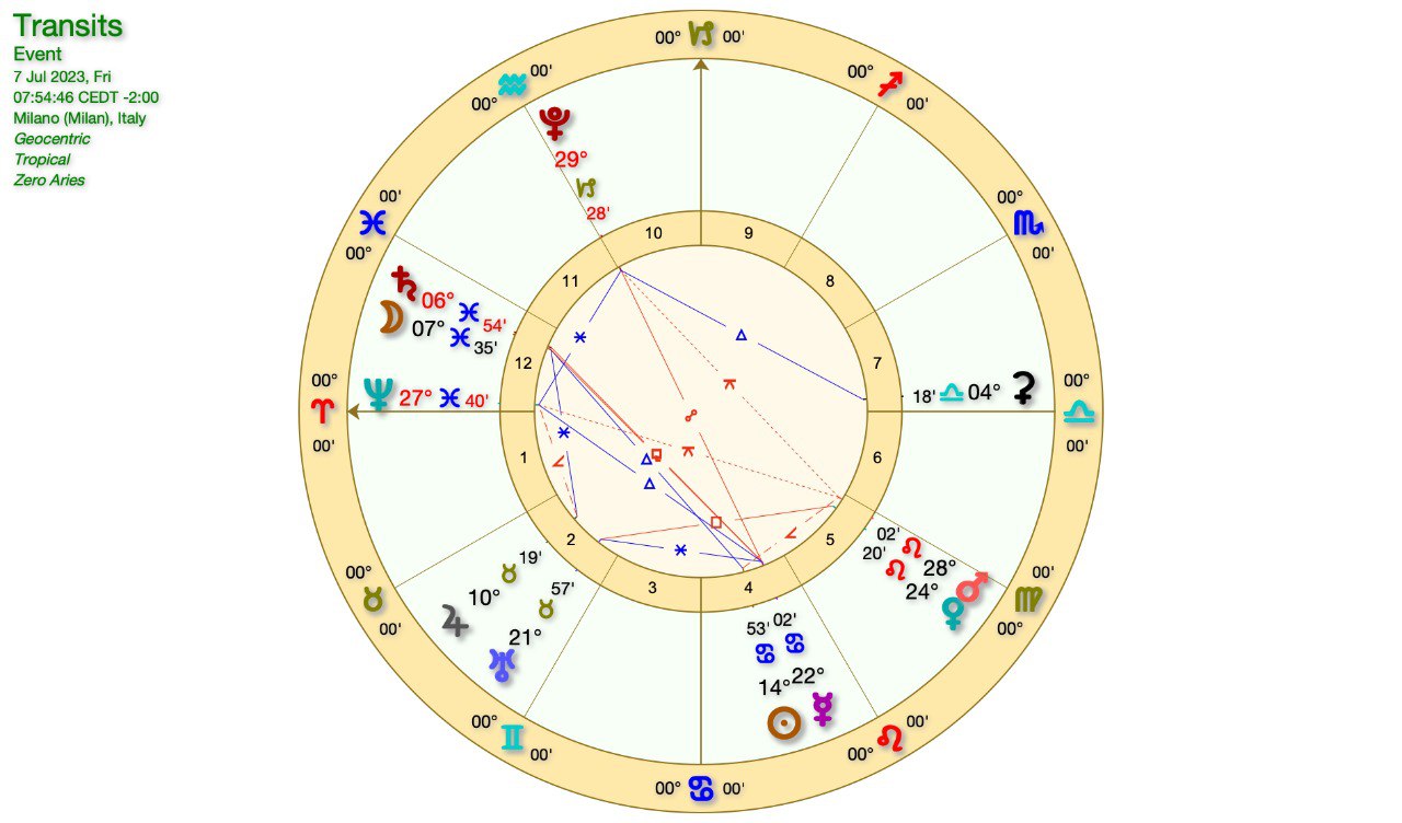 La LUNA oggi è in ACQUARIO, in QUADRATURA a GIOVE in TORO, mentre VENERE in LEONE si trova in QUADRATURA a URANO in TORO.