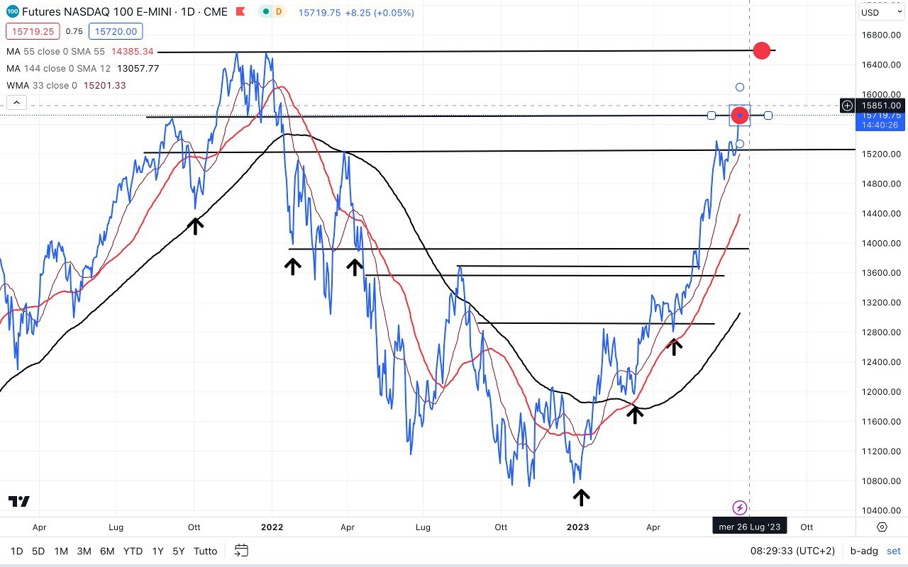 Questo, qualcuno lo ricorderà, è un grafico del NASDAQ 100 che avevo pubblicato qualche settimana fa quando i mercati stavano scendendo, mentre io ipotizzavo si potesse raggiungere l’obiettivo rialzista attorno ai 15700 punti indicato con il cerchiolino ROSSO.