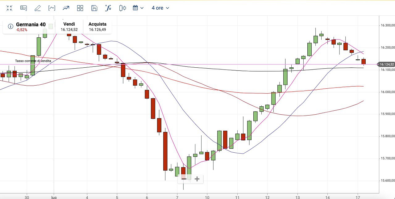 Una accelerazione al ribasso potrebbe arrivare in caso di rottura del supporto che passa attorno ai 16080-16090 punti.