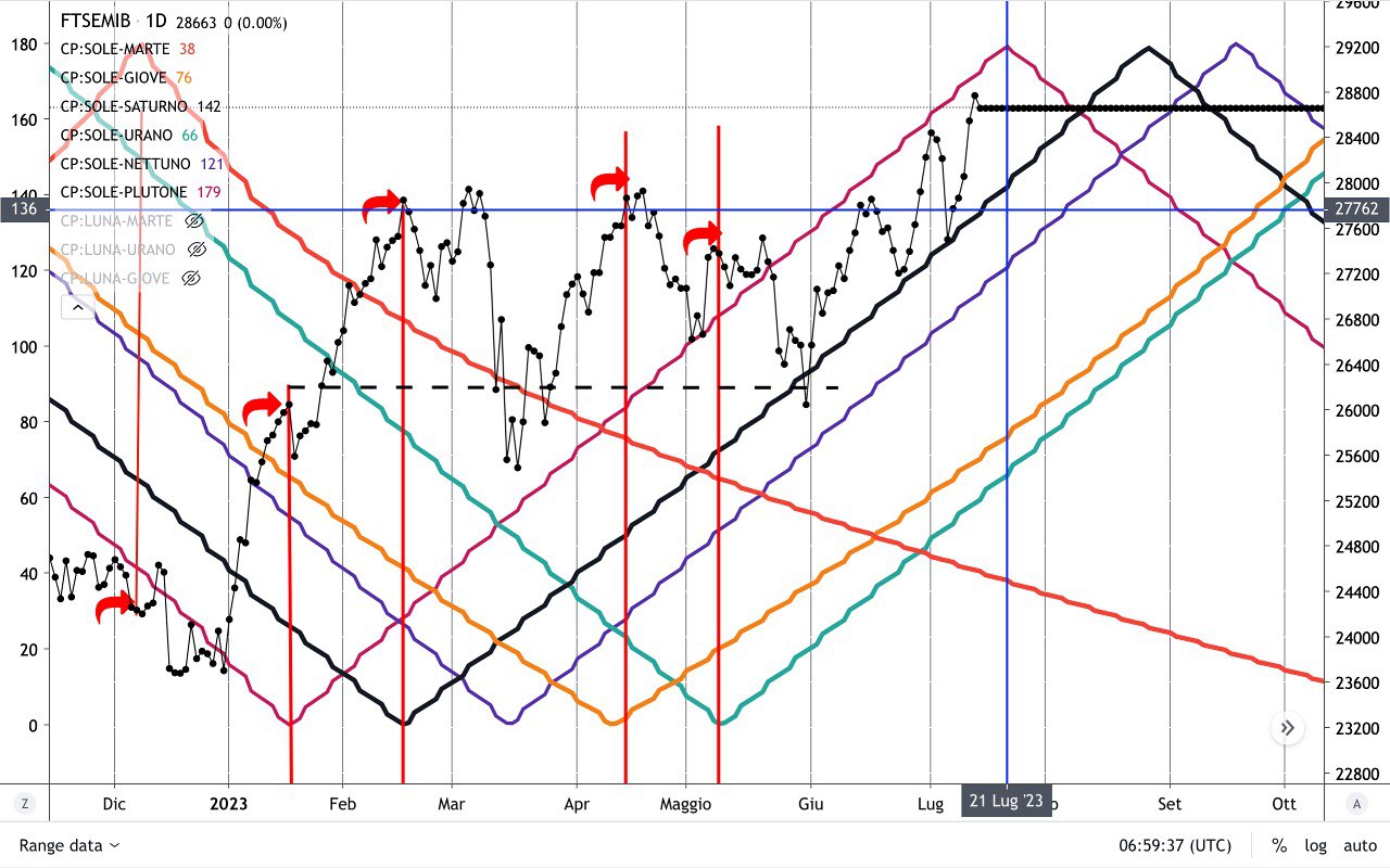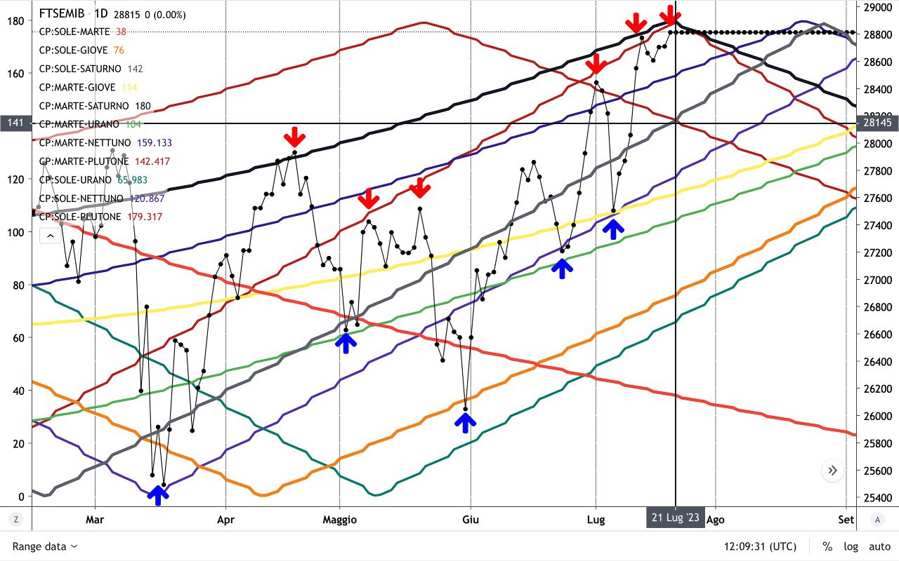 In ottica di STUDIO e di APPROFONDIMENTO, qui sotto potete vedere i CICLI di SOLE e di MARTE sull’indice italiano FTSE MIB negli ultimi mesi….
