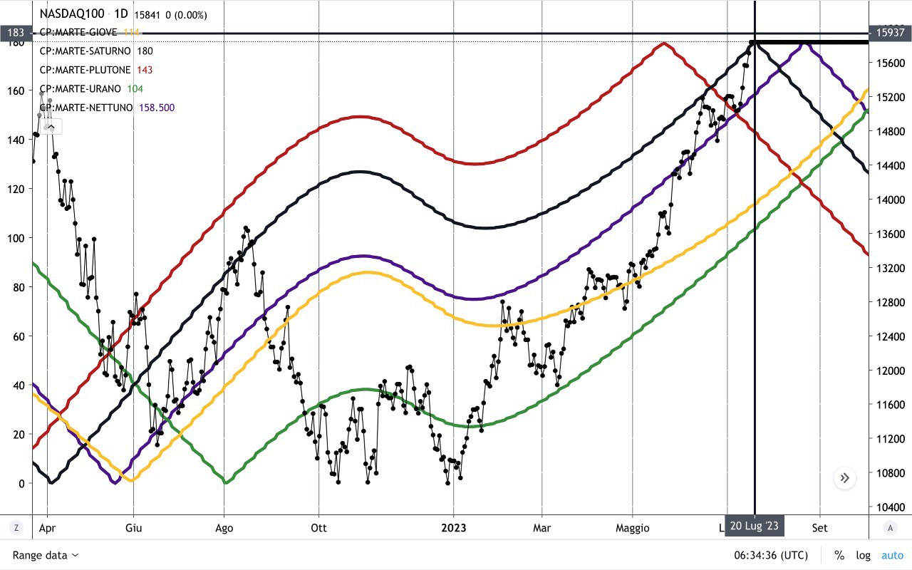 Il CICLO MARTE-SATURNO sta accompagnando l’ascesa del NASDAQ 100, mentre l’OPPOSIZIONE sarà al grado tra il 20 e il 21 Luglio.