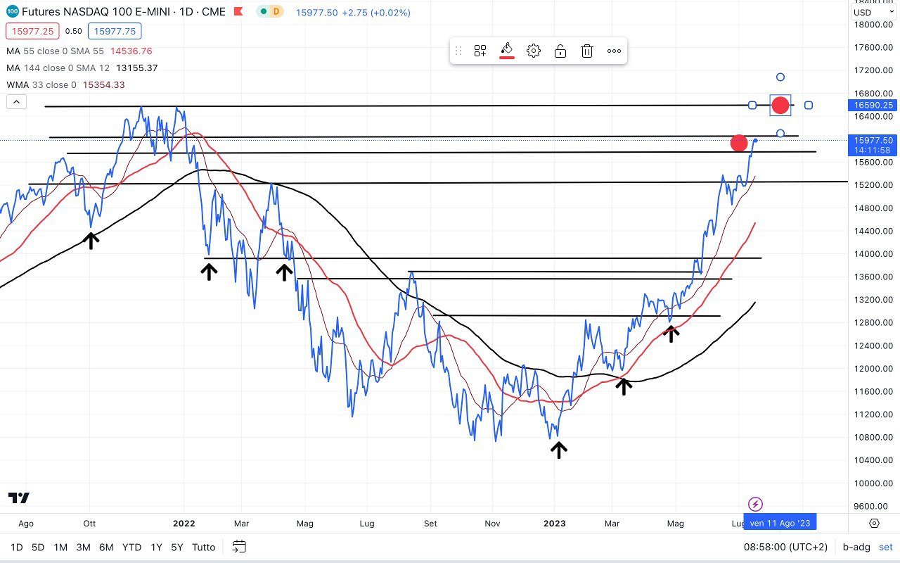 Riprendiamo velocemente il grafico del NASDAQ 100 (ricordo in ogni caso che in questa fase non lo stiamo considerando ai fini operativi).