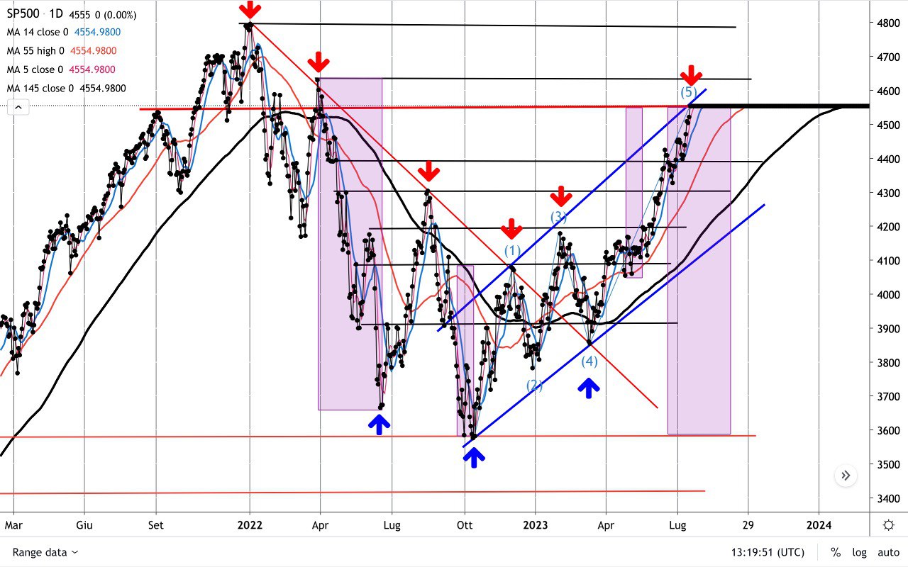 L’ultimo movimento rialzista, partito dai MINIMI di fine Aprile inizio Maggio (4050 punti circa) potrebbe essere arrivato a TARGET (4550 circa ieri), in quanto la misura percorsa è IDENTICA al primo movimento al RIALZO (a sinistra nel grafico) che era partito a fine Settembre – inizio Ottobre 2022 fino ai MASSIMI di Novembre 2022.