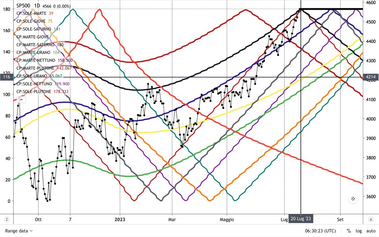 Dopo aver visto ieri pomeriggio i grafici tecnici e temporali dell’indice americano S&P500, oggi vi mostro l’ottima correlazione con i CICLI PLANETARI e con l’importante doppio SET UP del 20-21 Luglio (OPPOSIZIONE di SOLE-PLUTONE e MARTE-SATURNO).