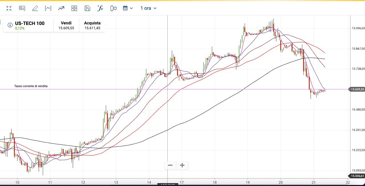 Il NASDAQ 100 dunque è sceso dagli oltre 16000 punti del giorno prima ai 15600 punti attuali, un movimento di oltre 400 punti.