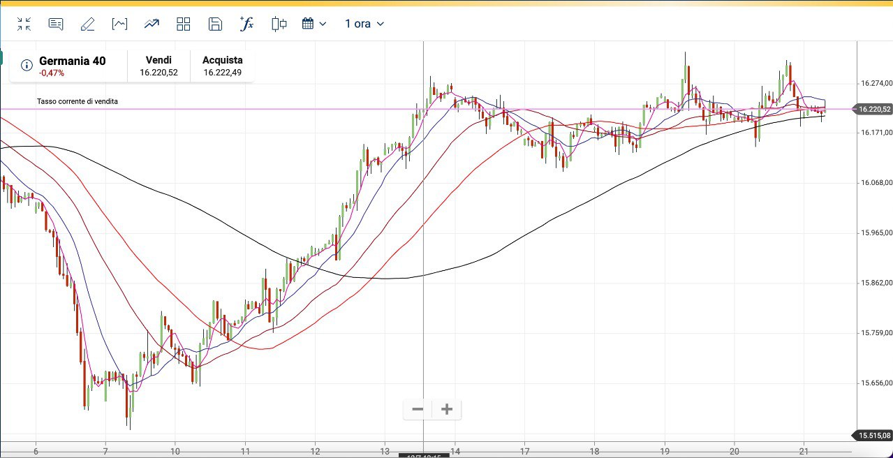 Il DAX tedesco, dopo essere andato ieri nuovamente sopra i 16300 punti stamattina oscilla poco sopra i 16200 punti.