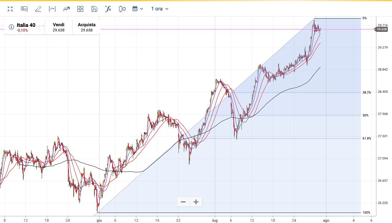 Da verificare dunque se quello raggiunto Giovedì 27 Luglio (attorno ai 29850 di MIB FUTURE) possa essere effettivamente un MASSIMO da cui ridiscendere…