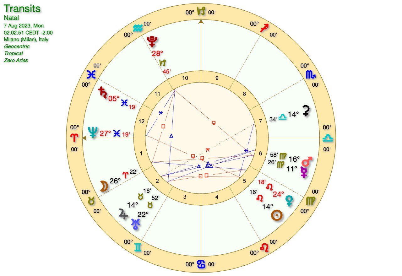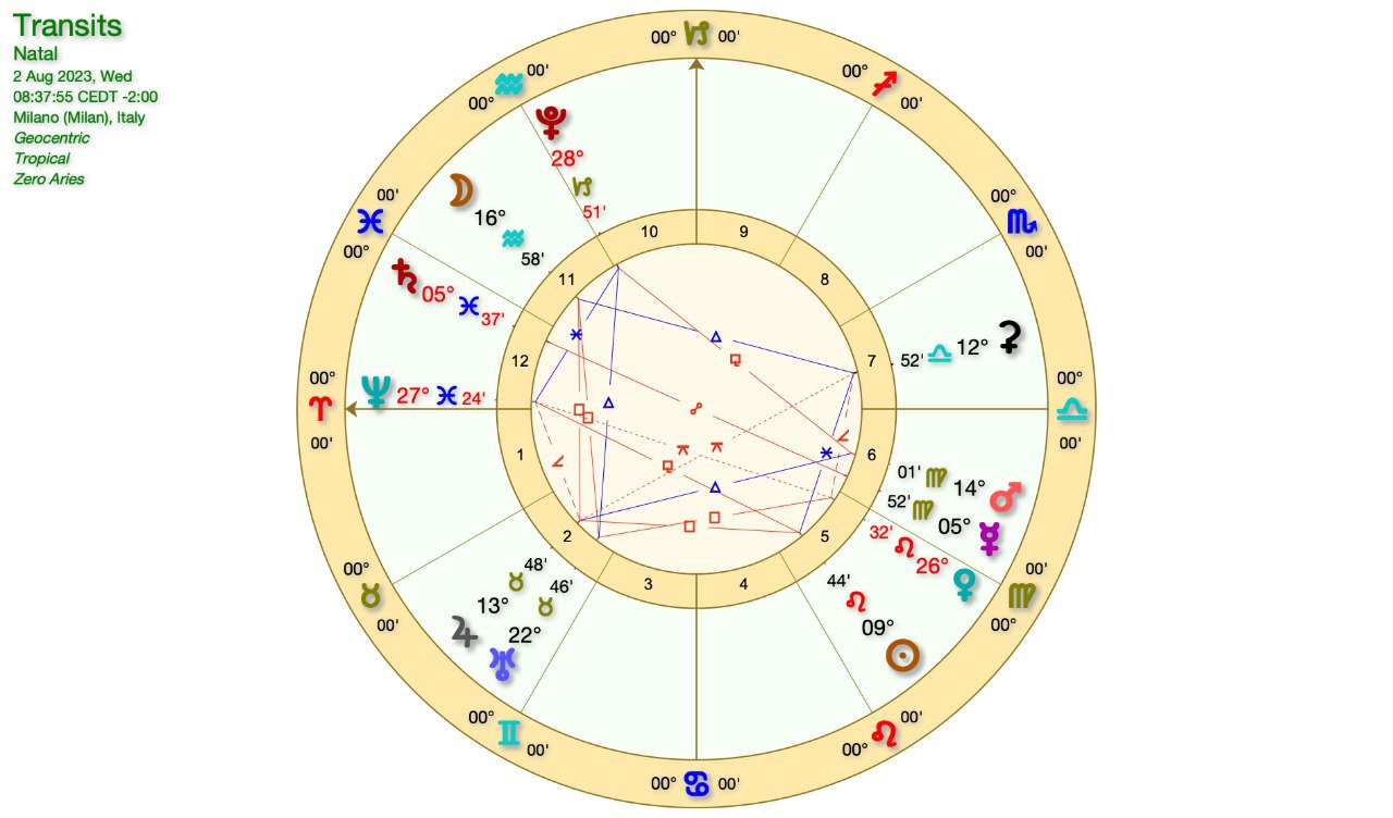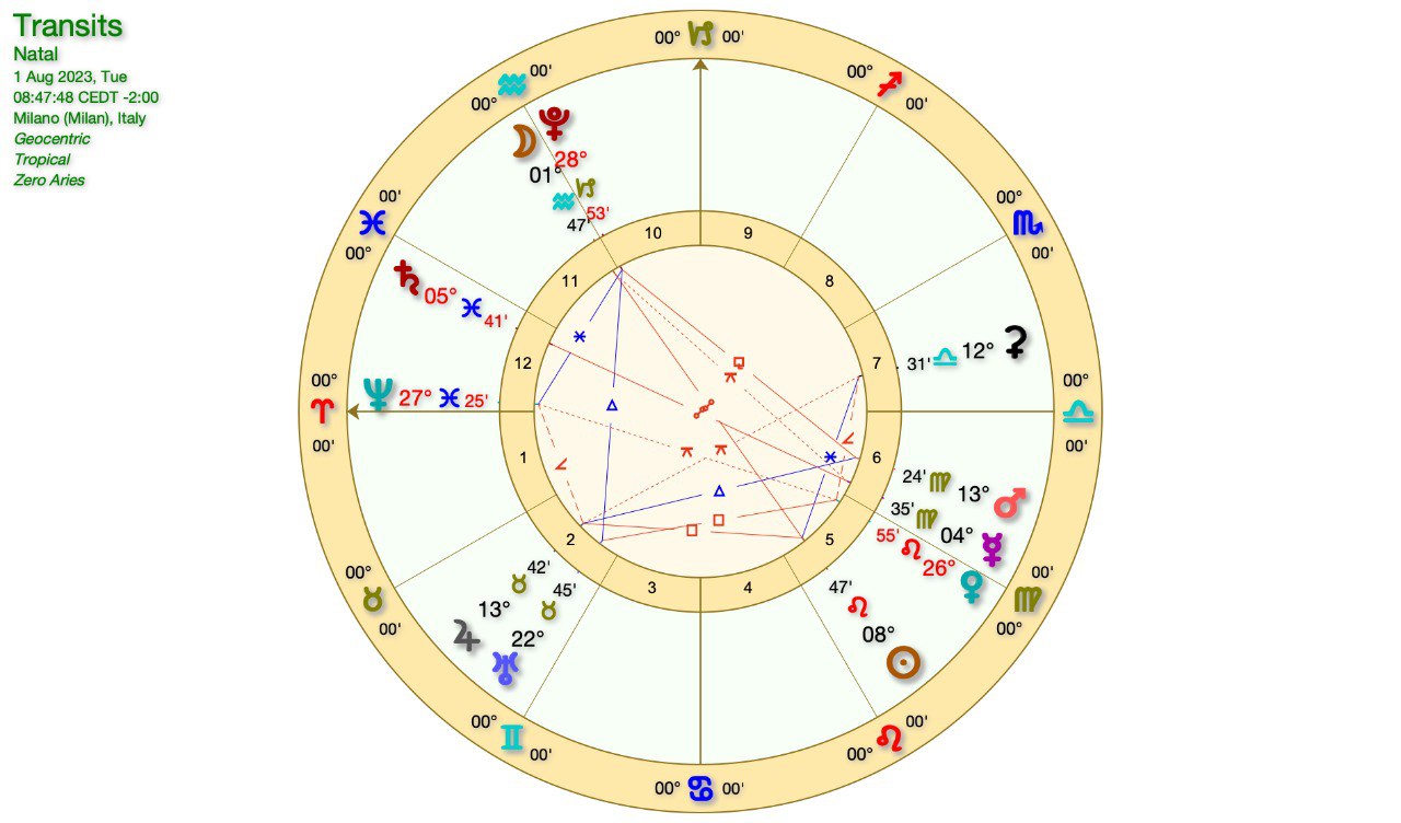 Questo intanto è il grafico di Lunedì, quando il SOLE in LEONE sarà in QUADRATURA a GIOVE in TORO.