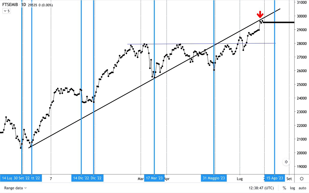 VI mostro ora un grafico molto interessante sul FTSE MIB, sul quale è stata tracciata una RETTA dal MINIMO di fine Settembre – inizio Ottobre 2022, passante per il MINIMO di Marzo 2023 e fino al massimo di ieri 31 Luglio (possibile importante RESISTENZA)
