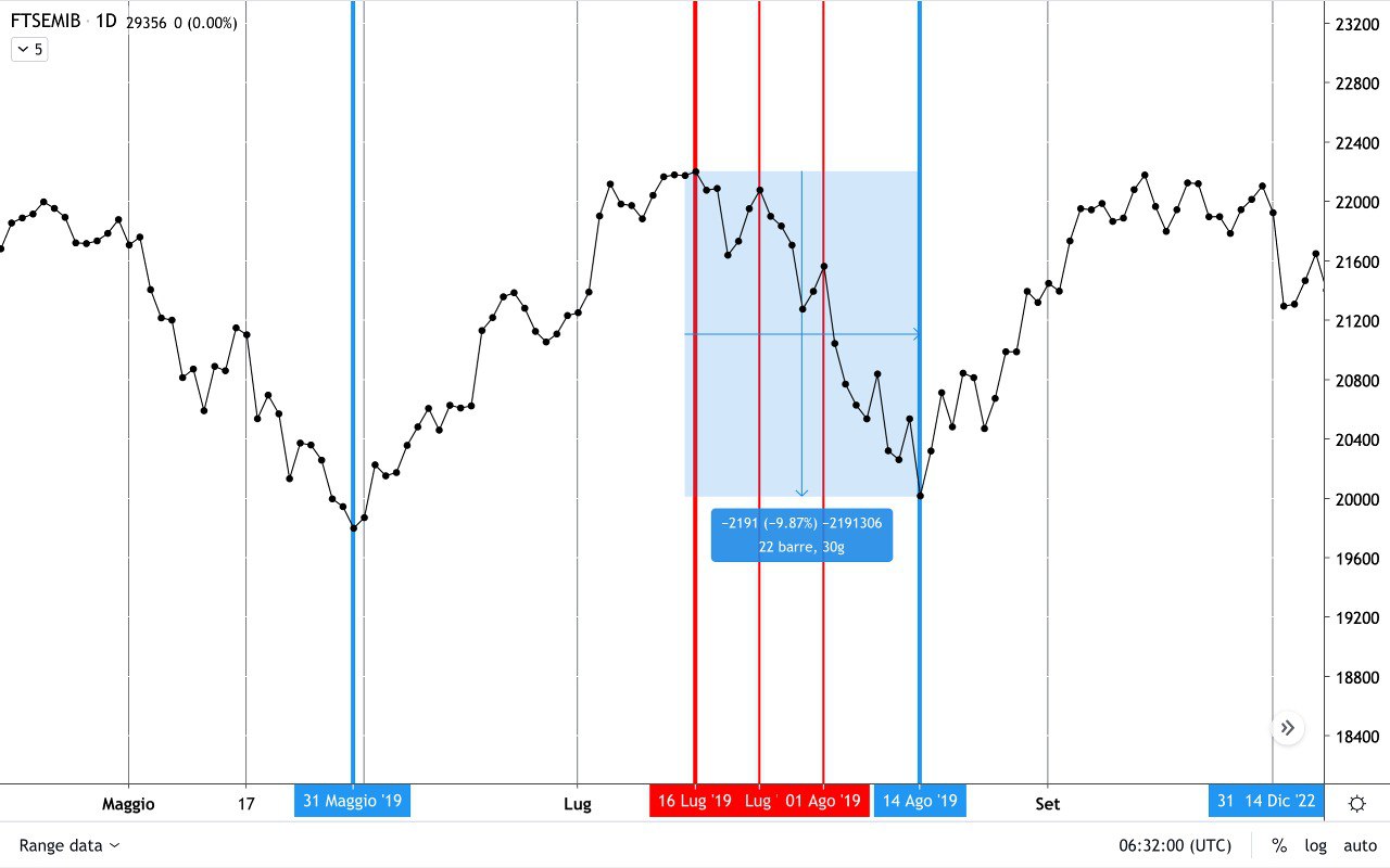 Dal massimo relativo del 21 Luglio al minimo del 10 Agosto il nostro indice scese complessivamente di circa 5000 punti, dai 19500 ai 14500 punti circa.