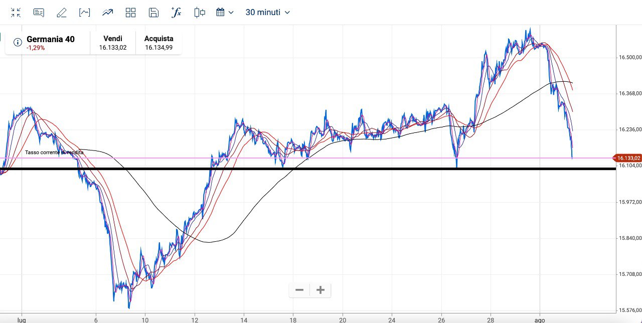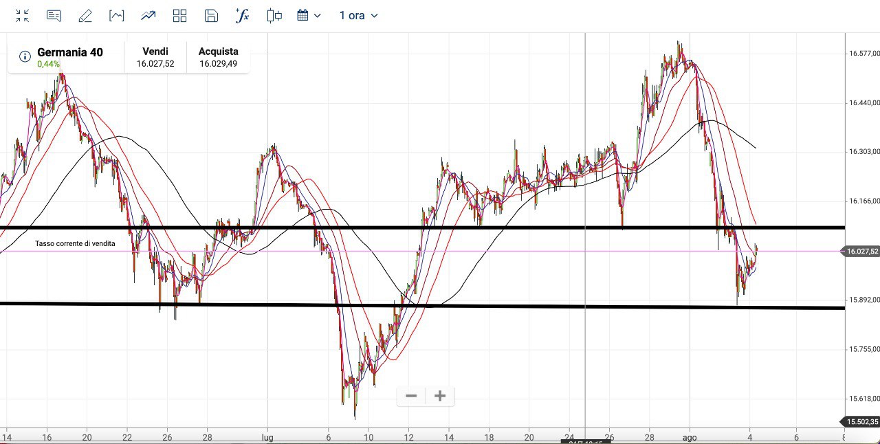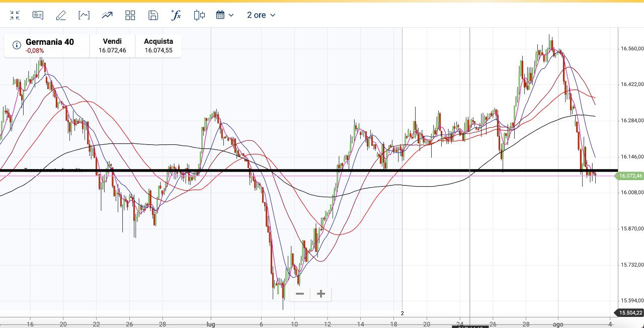Il DAX è rimbalzato dal supporto dei 15900 punti ed ora sta ritornando verso il precedente supporto dei 16080-16100 circa.