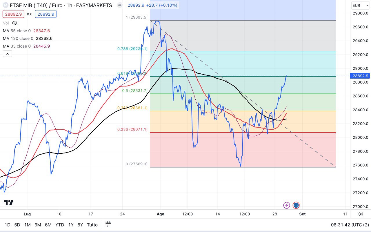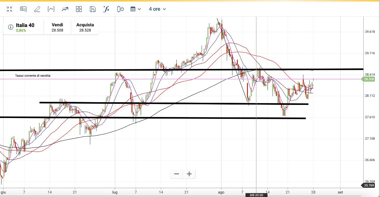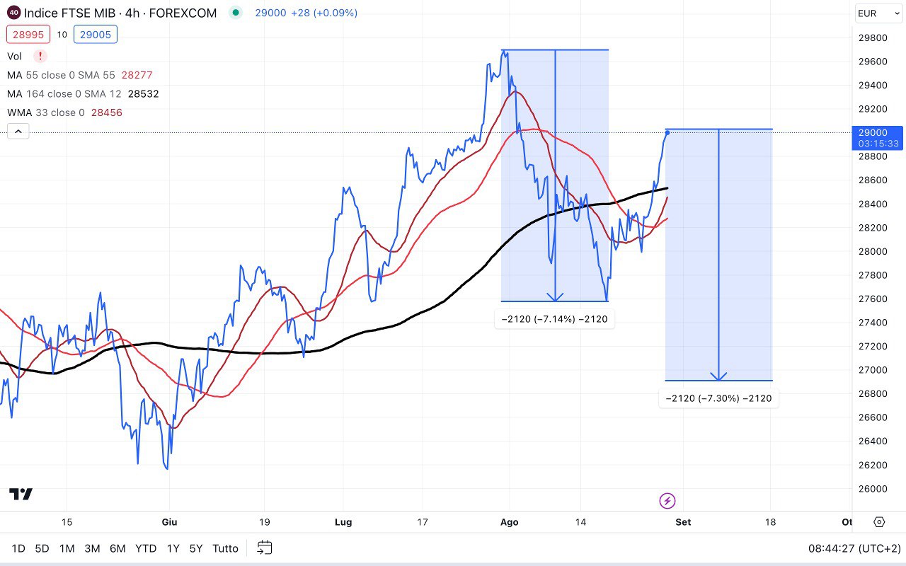 Il dato di fine giornata del 24 Agosto era ancora più conveniente, in quanto il MIB era sceso attorno ai 28100 punti, dove era stata aperta la POSIZIONE al RIALZO….