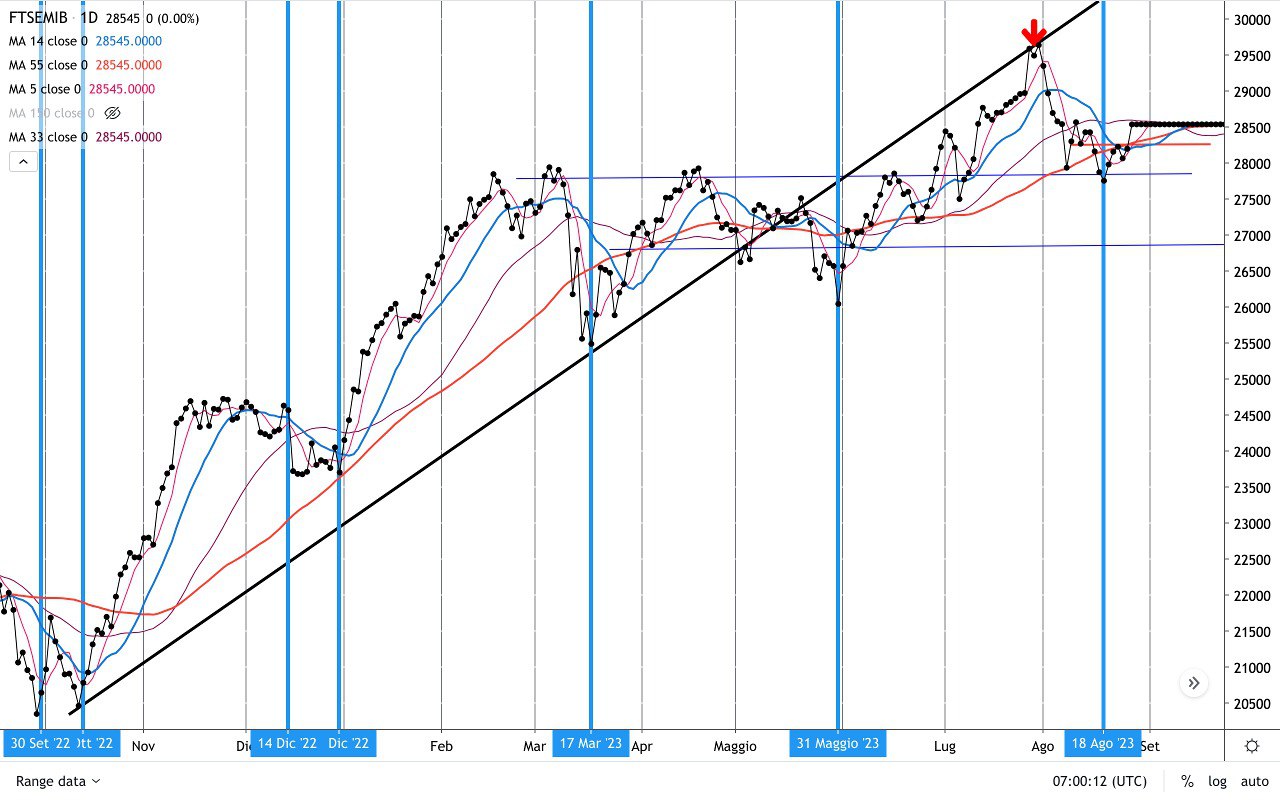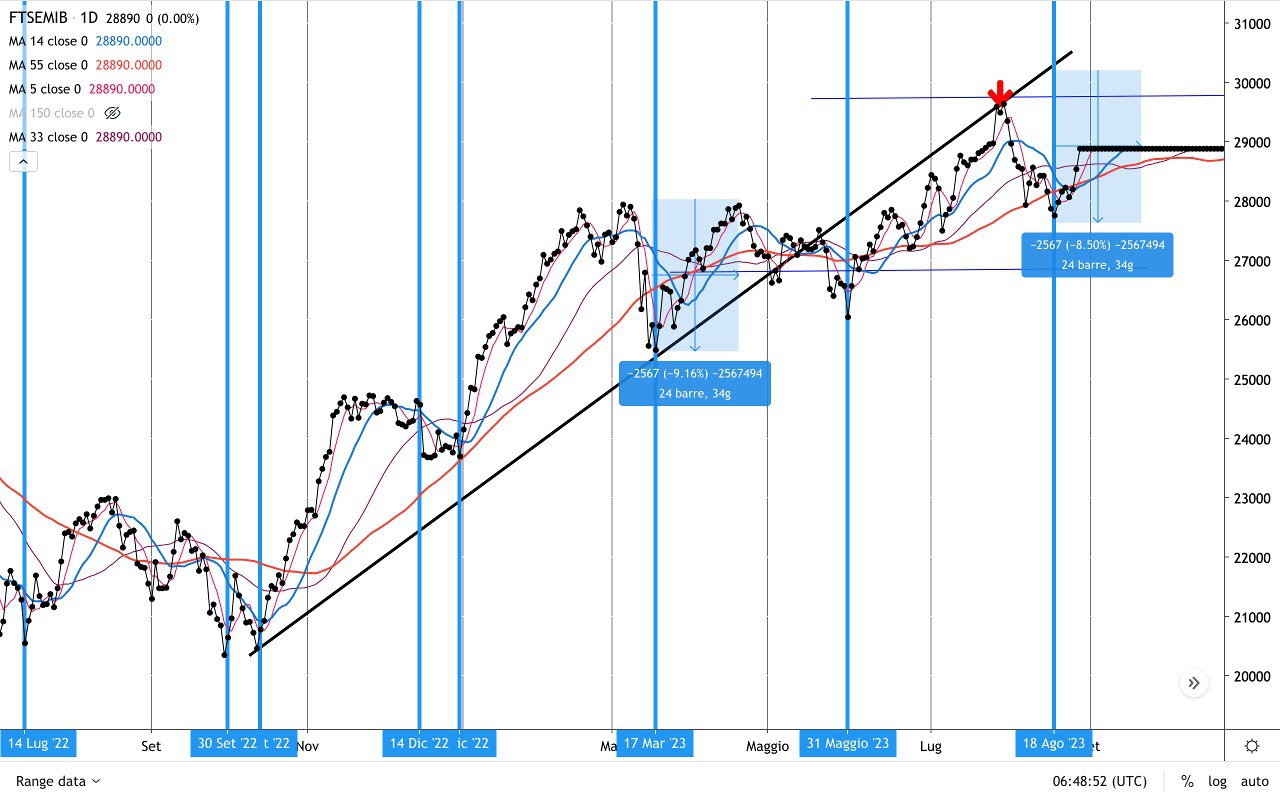 – il mercato è ribassista dal MASSIMO di fine Luglio e quindi potrebbe ora riprendere la discesa (l’obiettivo di risalita sui 28900-29100 era già stato preventivato qualche settimana fa).