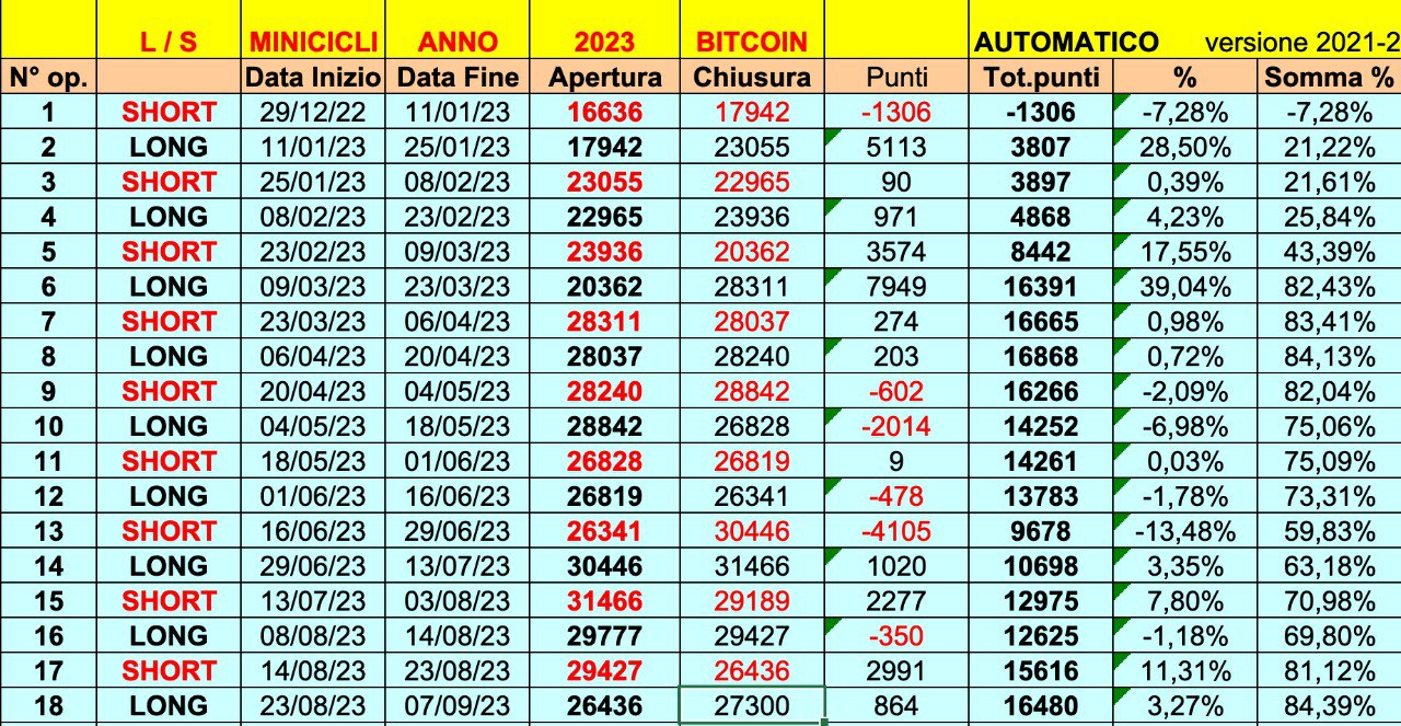 Vi aveva accennato al fatto che il BITCOIN stava tornando ad avere un’OTTIMA CORRELAZIONE con i MINICICLI, quindi qui sotto vi mostro il riepilogo di tutte le ONDE in AUTOMATICO (versione 2021-2022) nell’anno in corso 2023.