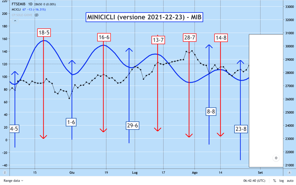 Da Aprile in avanti questa versione dei MINICICLI sta funzionando molto bene, rispettando sia la MEDIA STORICA ( 7 ONDE su 10) che fornendo il SET UP INVERSO di fine Luglio, correttamente interpretato in base all’esperienza maturata in precedenti circostanze storiche.