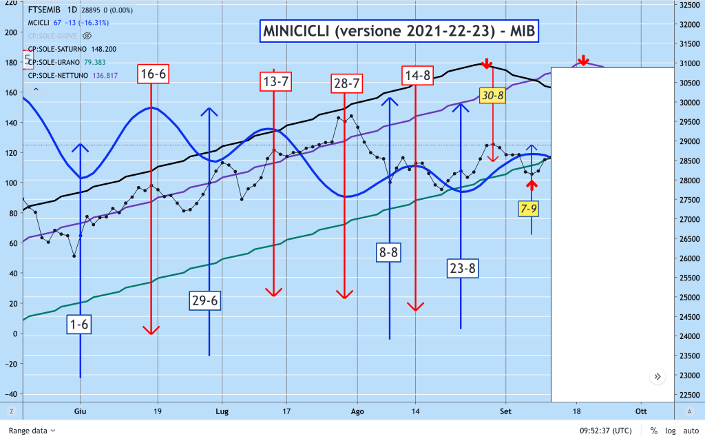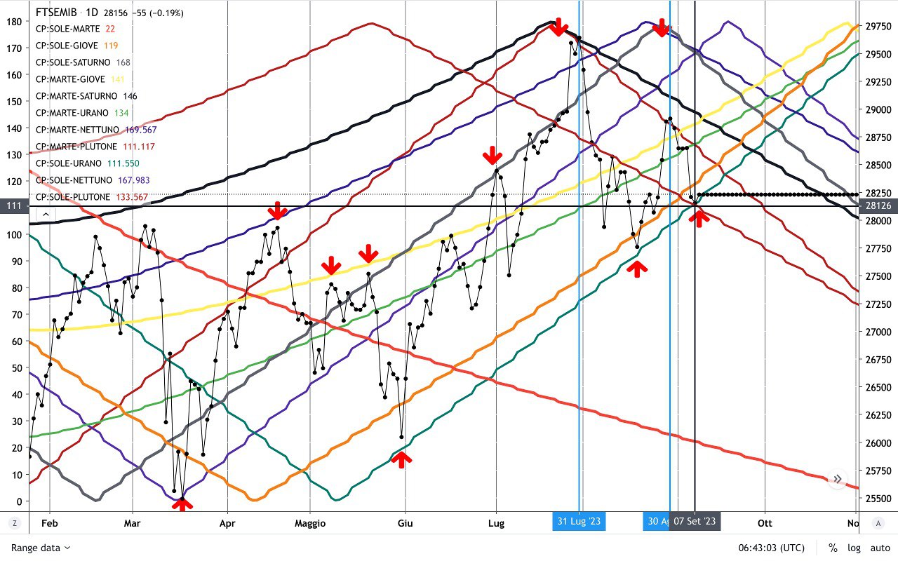 Riguardo ai mercati, nella giornata di Venerdì 8 Settembre è stato correttamente interpretato il SET UP sul GIAN TRADER corrispondente al SUPPORTO dalla LINEA VERDE del CICLO SOLE-URANO, che ha prodotto la RISALITA dai 27900-28000 di MIB agli attuali 28600 punti circa.