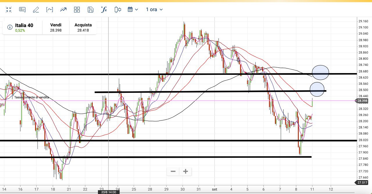 Ora ci troviamo sopra i 28450 punti, per cui in caso di continuazione del movimento avremmo un primo obiettivo attorno ai 28500-28600 (precedente supporto bucato al ribasso) e poi verso i 28800-28900 punti (altro precedente supporto bucato al ribasso la settimana scorsa).