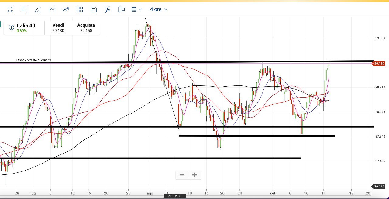 Attenzione in questi giorni a notizie che potrebbero favorire improvvisi movimenti di prezzo e inoltre teniamo conto che a fine settimana avremo la scadenza di opzioni e futures di Settembre (terzo Venerdì del mese e del trimestre).