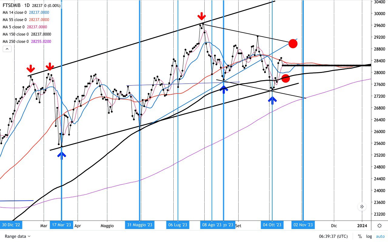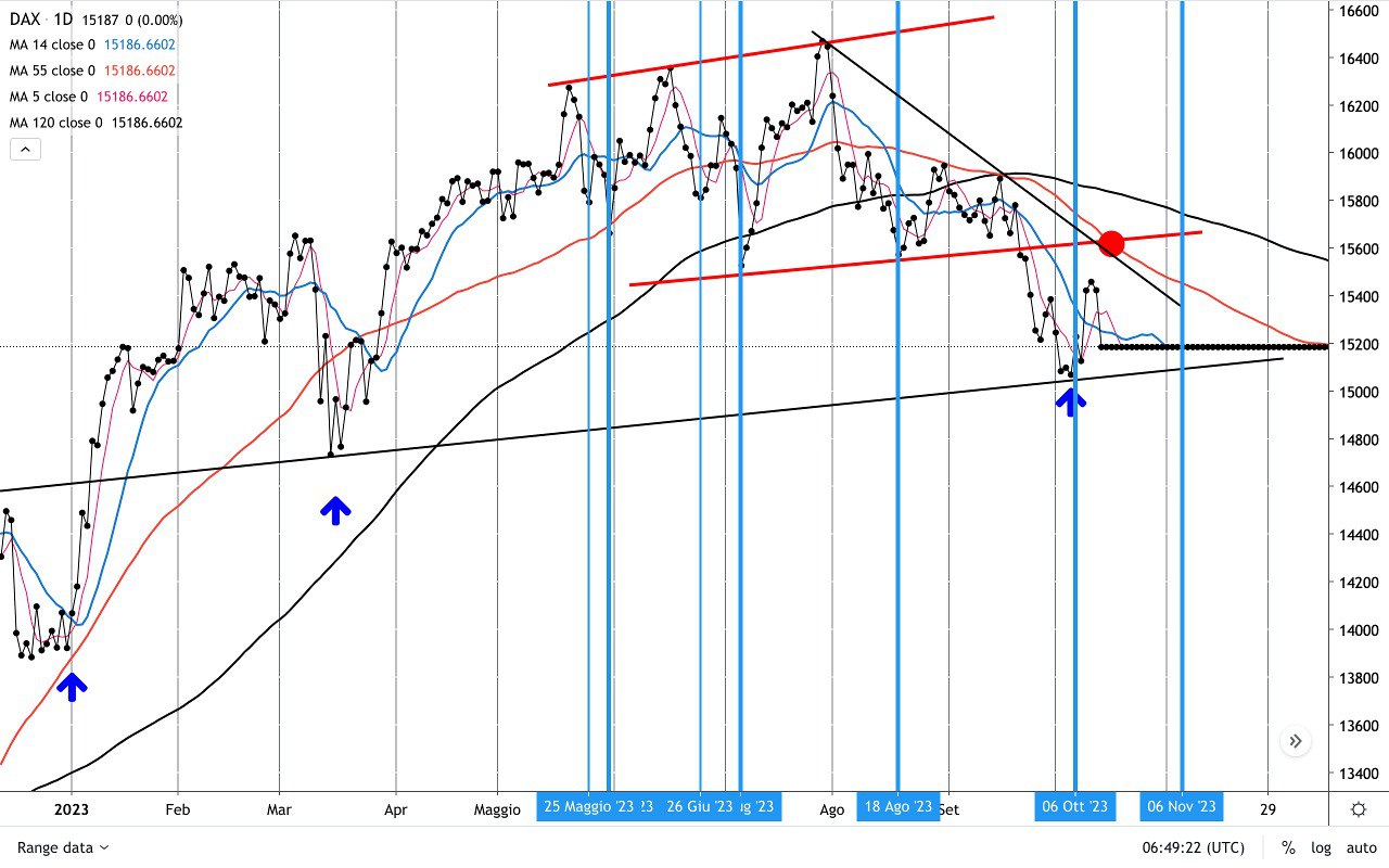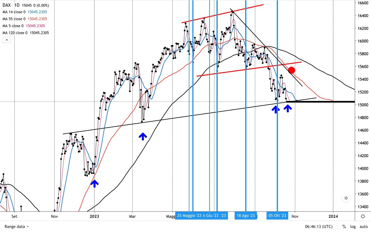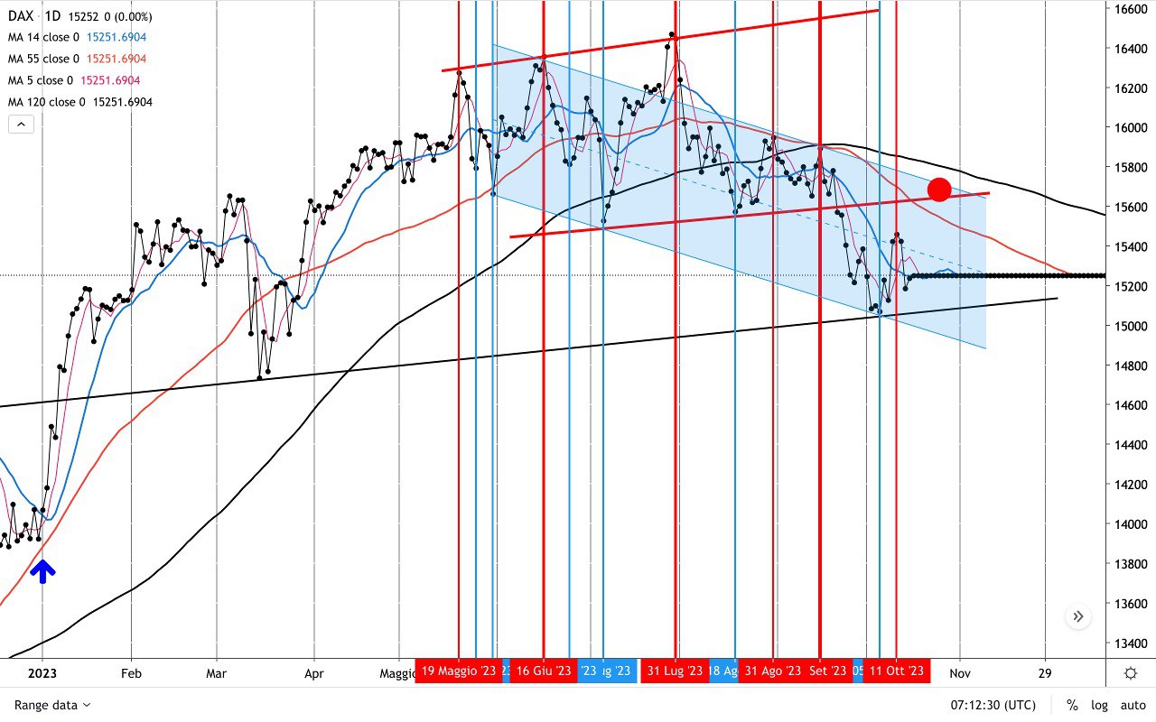 Saranno dunque cruciali le prossime sedute perchè il DAX, come detto, si trova abbastanza vicino al MINIMO del 4 Ottobre e potrebbe nuovamente “insidiarlo”, cioè arrivare nei pressi (un po’ sopra o un po’ sotto), prima di ripartire eventualmente verso l’ALTO (e in questo caso verso il bordo superiore del CANALE AZZURRO).
