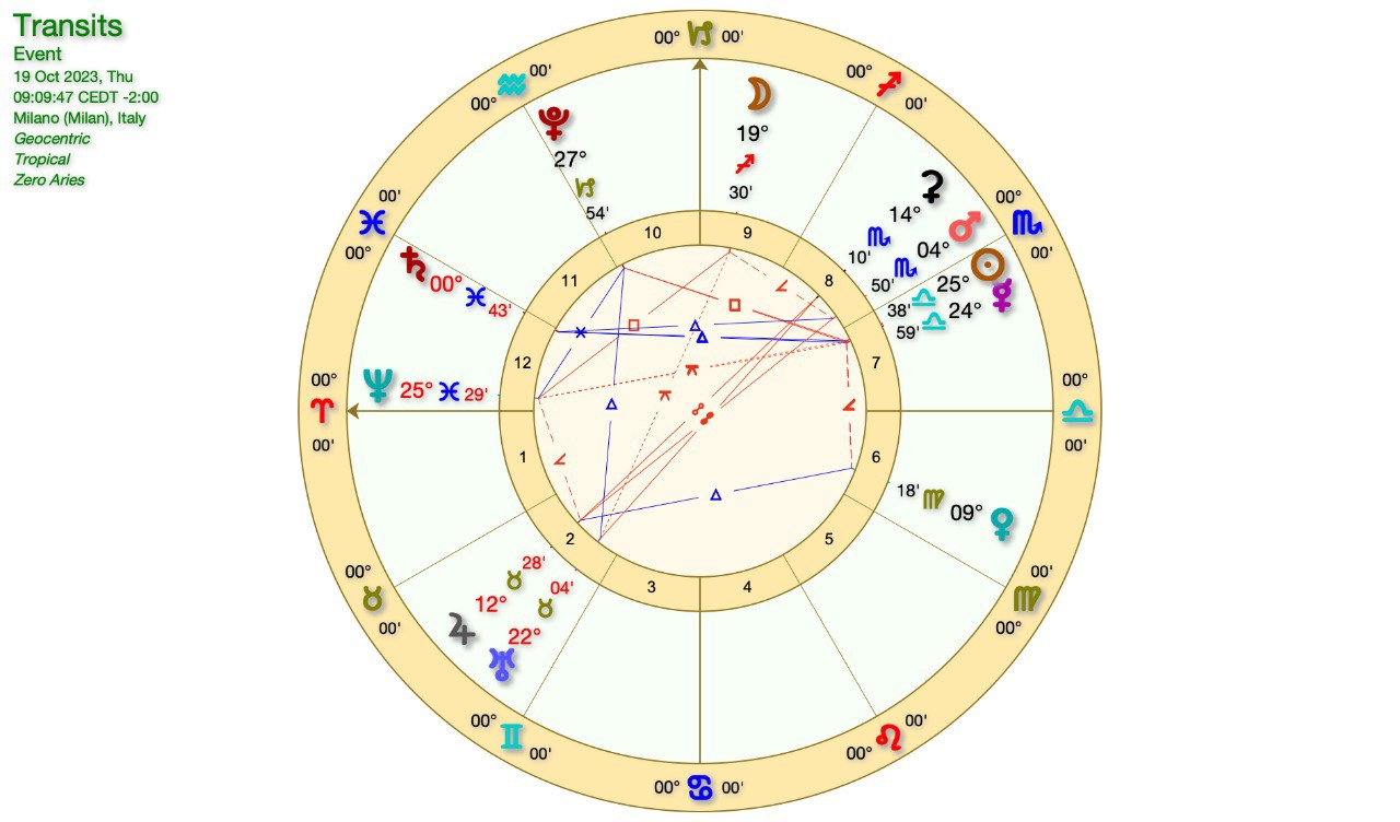 Dal punto di vista astrologico abbiamo una CONGIUNZIONE SOLE-MERCURIO quasi al grado, un TRIGONO MARTE-SATURNO e l’inizio dell’OPPOSIZIONE tra MARTE in SCORPIONE e GIOVE in TORO, che sarà al grado il giorno 28 Ottobre.