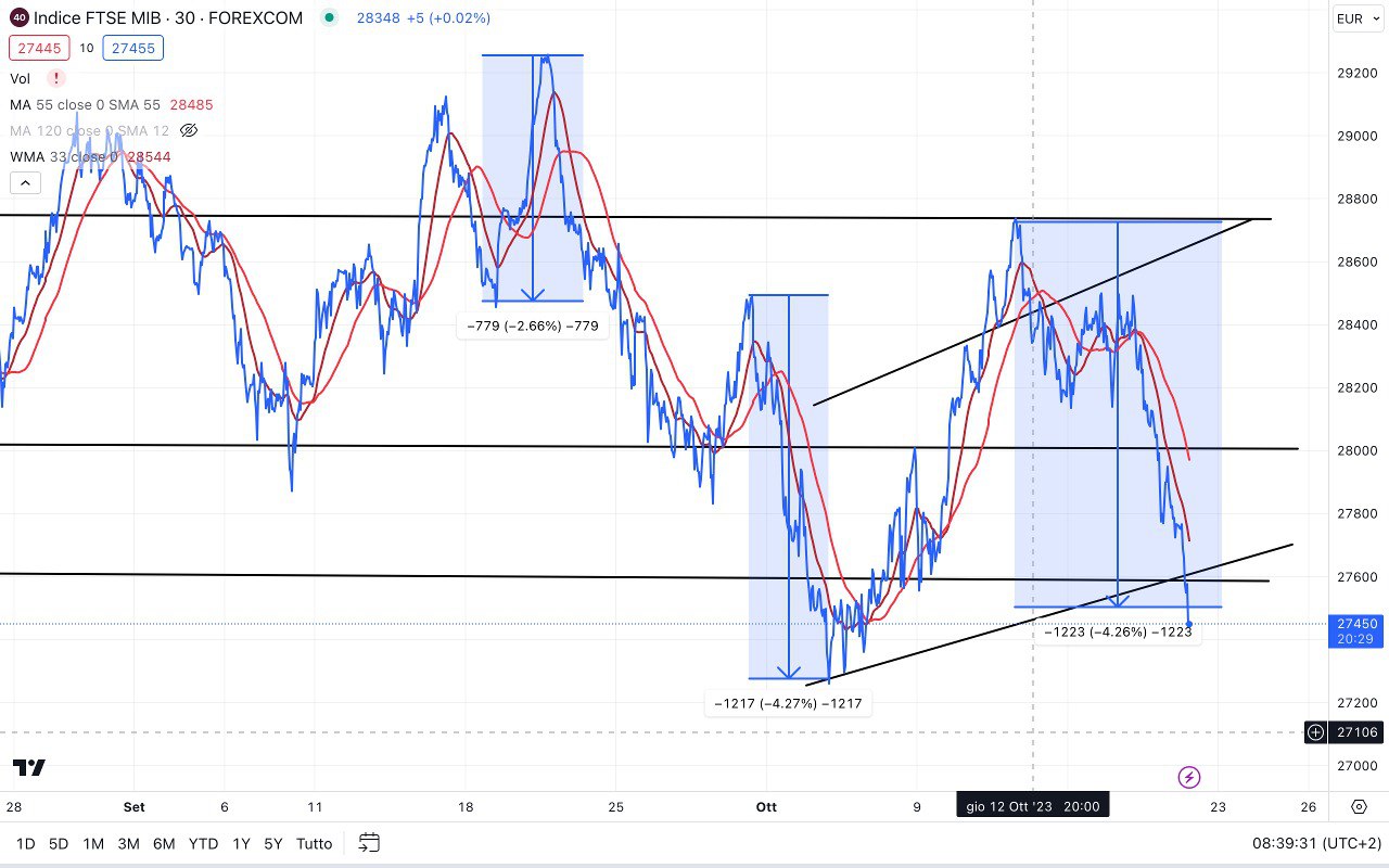 Avevamo un ipotetico supporto tra i 27700 e i 27900 punti, che però è stato bucato con forza, quindi siamo scesi nella zona che già avevamo incontrato nella prima settimana di Ottobre, tra i 27300 e i 27500 punti, dove ci troviamo ora.