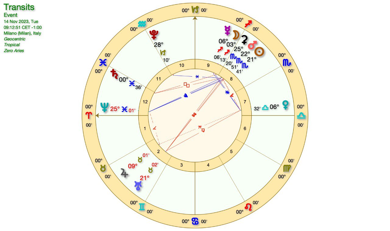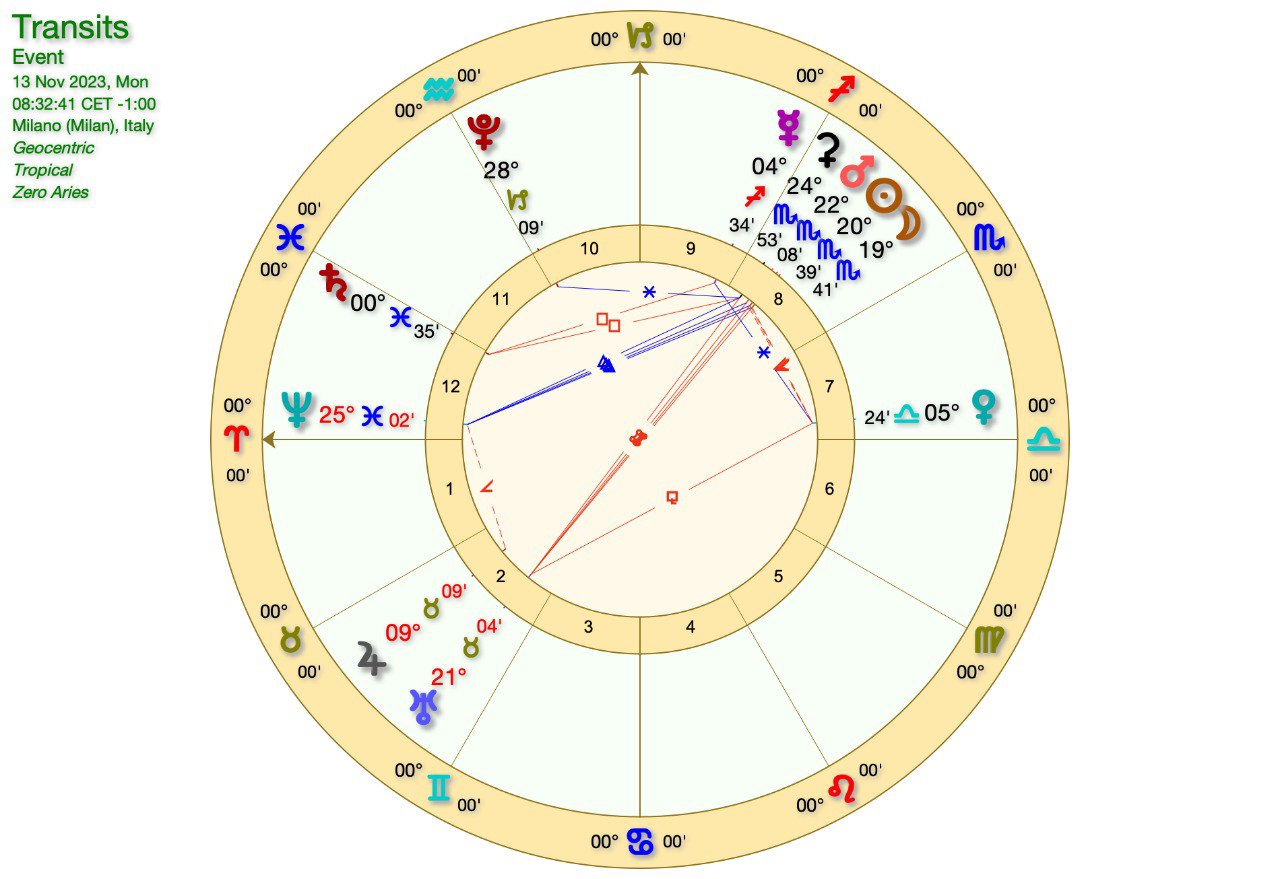 La LUNA nel frattempo è entrata in SAGITTARIO in CONGIUNZIONE a MERCURIO e in QUADRATURA a SATURNO in PESCI.