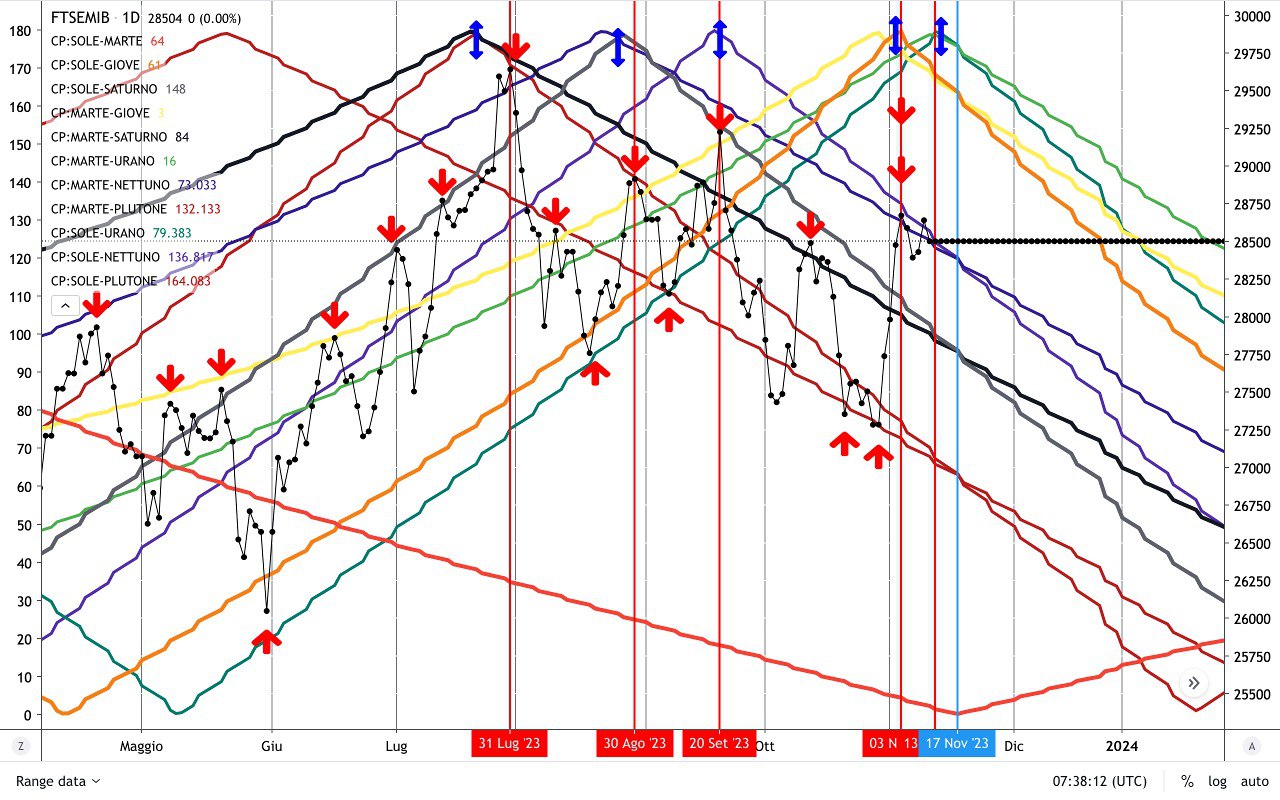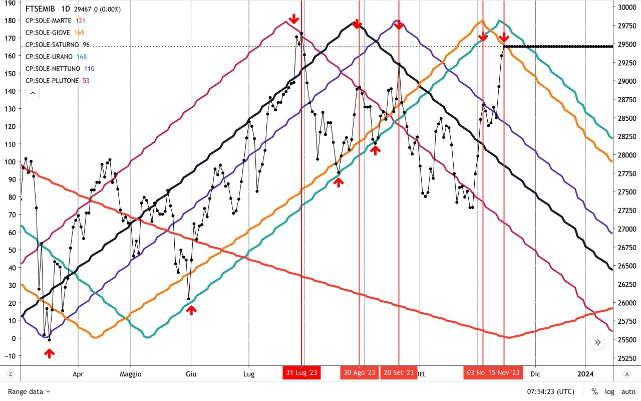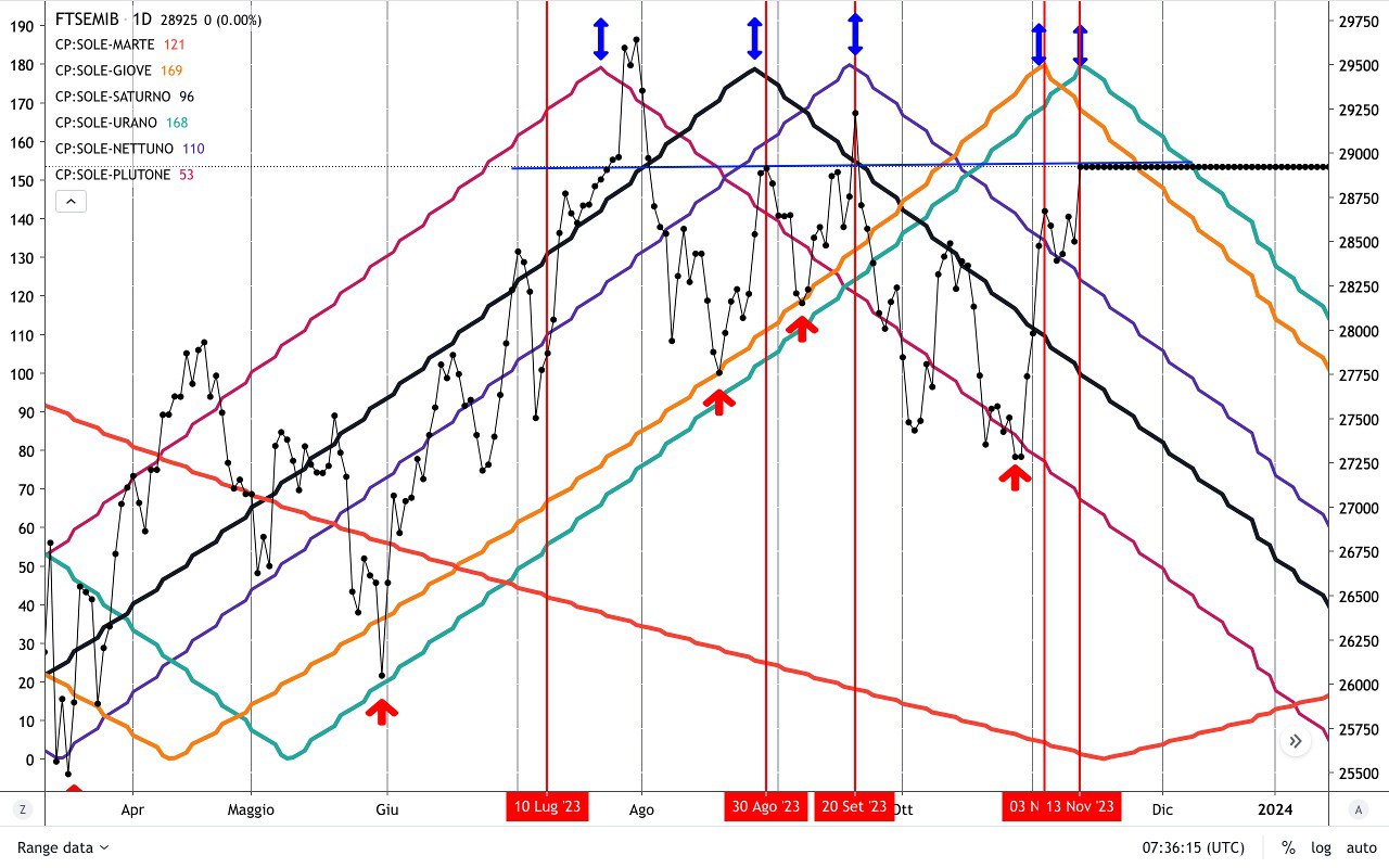 Conoscete già la situazione planetaria, riassunta qui sotto nel grafico dei CICLI SOLARI sul FTSE MIB.
