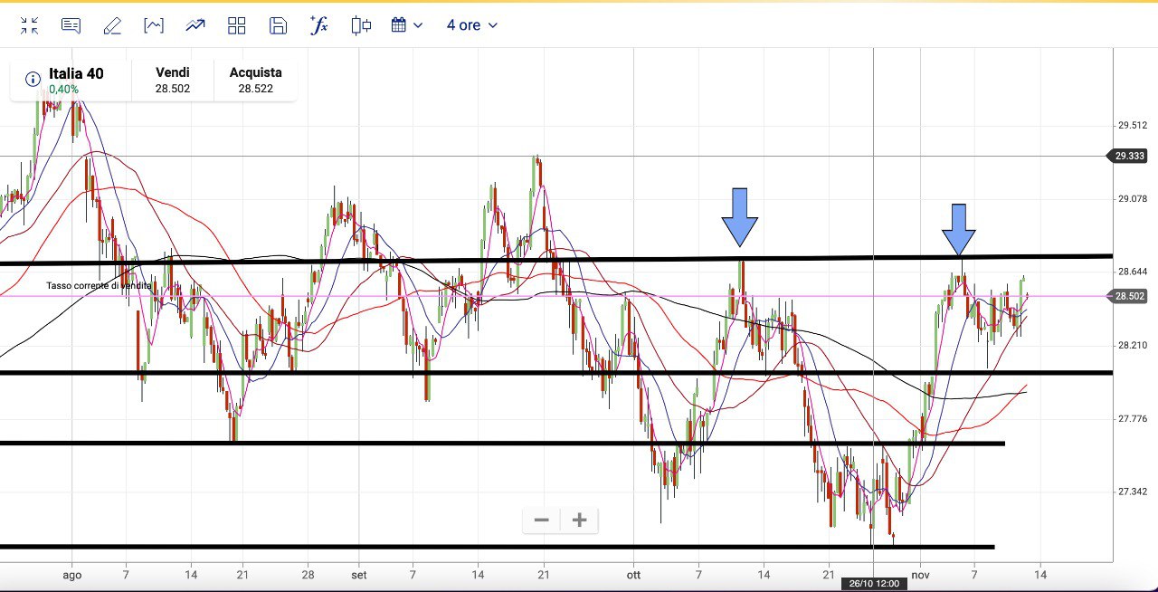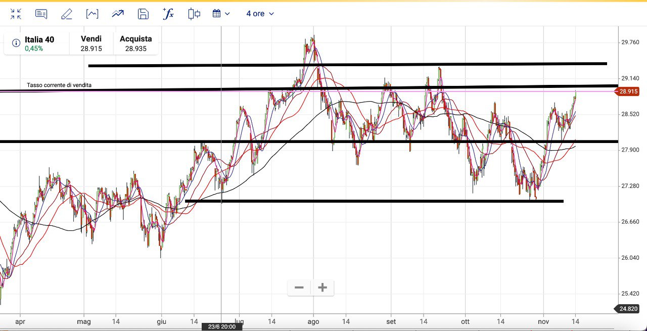 In questo frangente gli indici europei sembrano più avanti rispetto agli indici americani, nel senso che erano già tornati sui MASSIMI del 12 Ottobre, come vediamo qui sotto sul MIB.