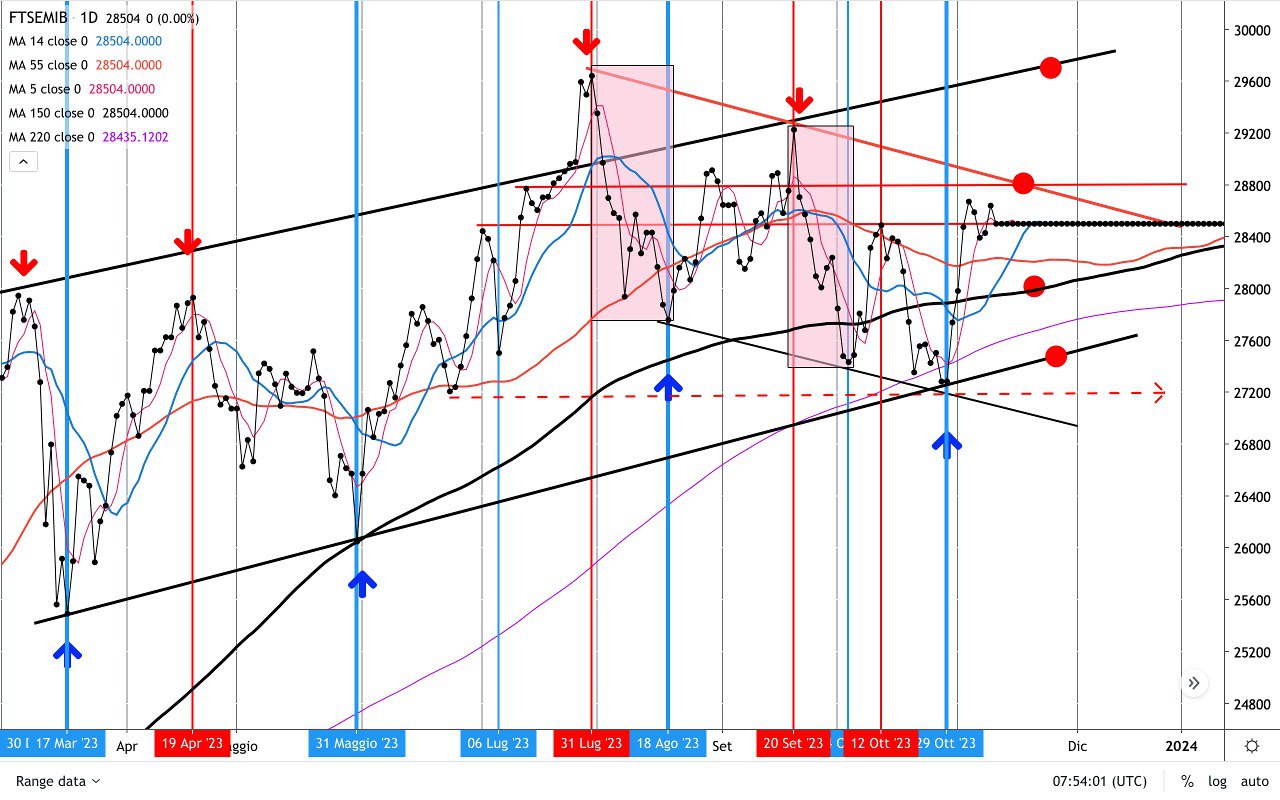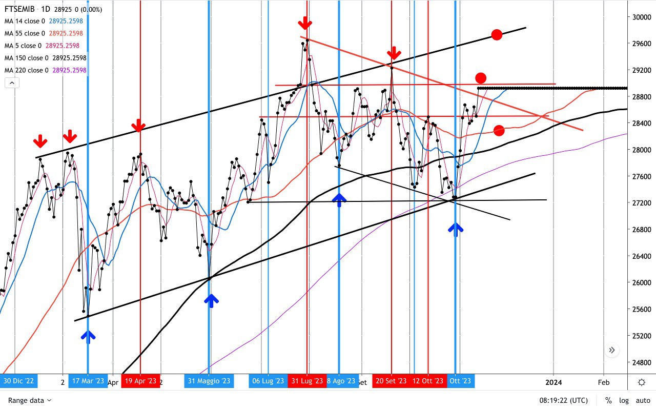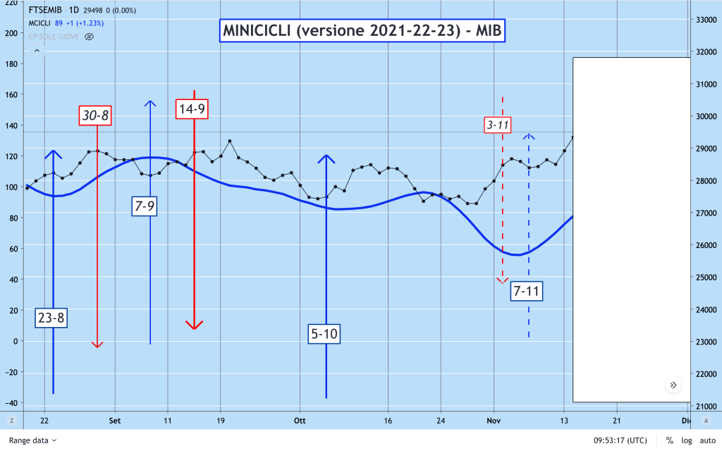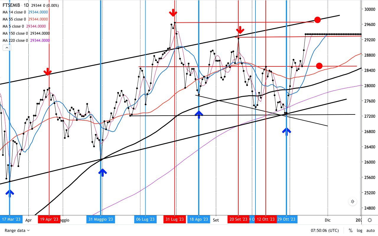 Il MINIMO del 27 Ottobre, ipotizzato con largo anticipo, ha dunque portato a questa forte ripartenza (il MIB ha già percorso 2000 punti al RIALZO).
