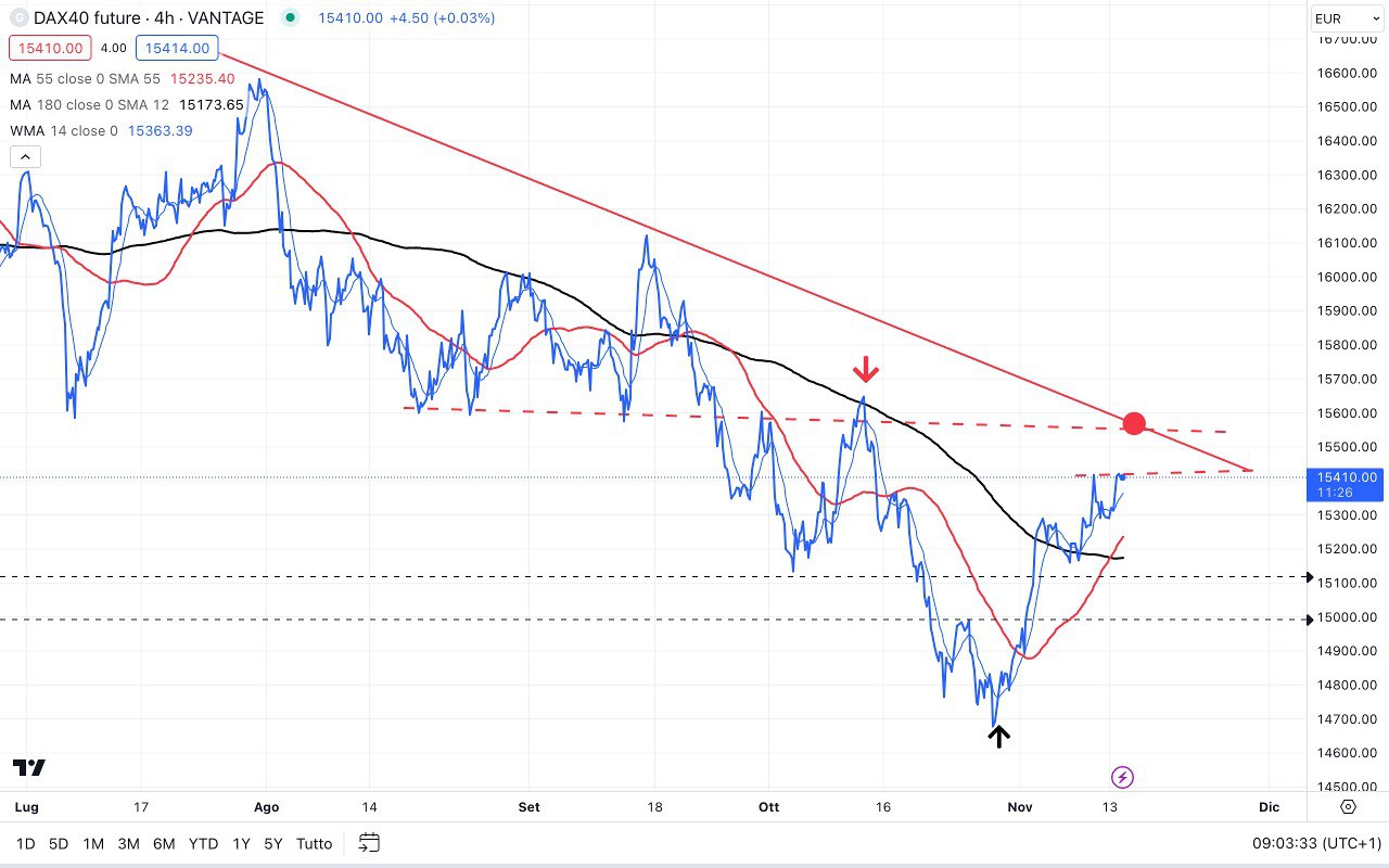 Il DAX future sta provando a superare gli ultimi massimi fatti poco sotto i 15450 punti.