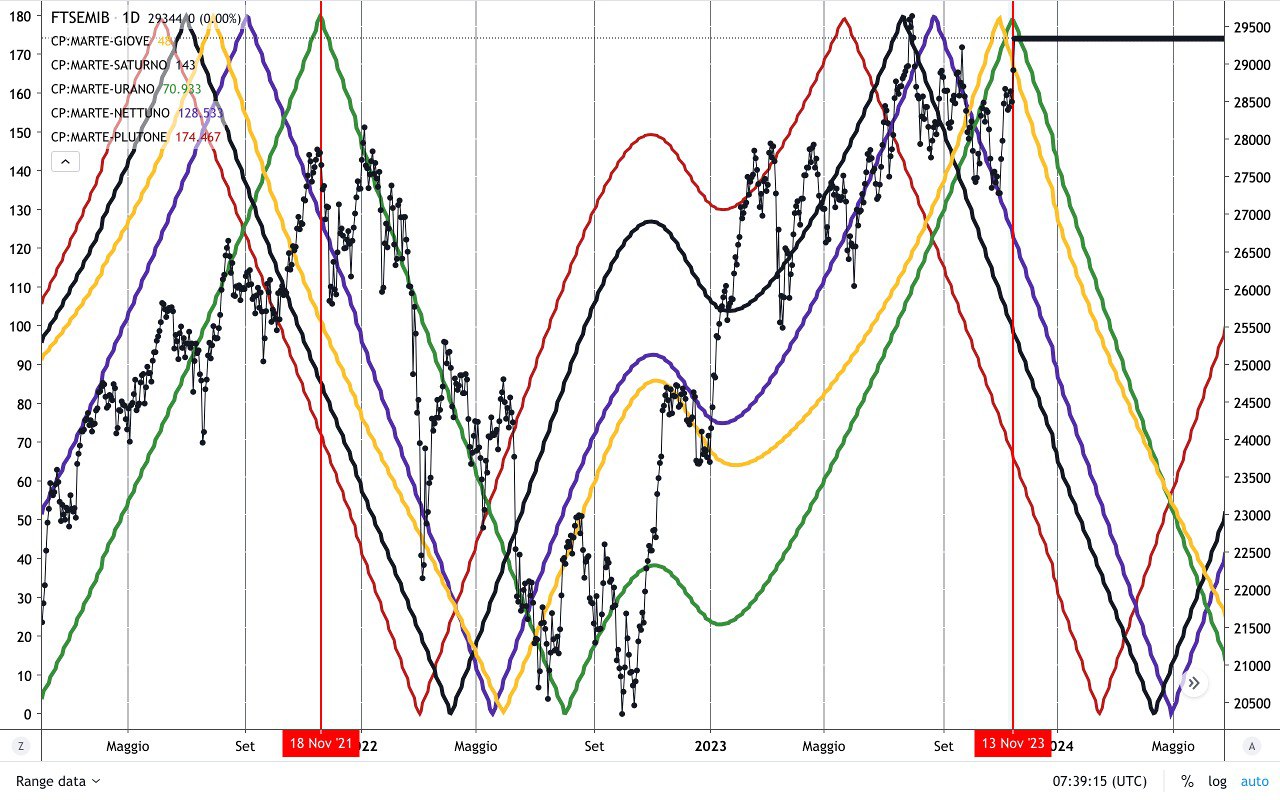 Nel 2021, sul picco dell’OPPOSIZIONE MARTE-URANO a metà Novembre vi fu un MASSIMO del Ftse Mib e una discesa, con risalita e altro massimo a inizio Gennaio 2022.