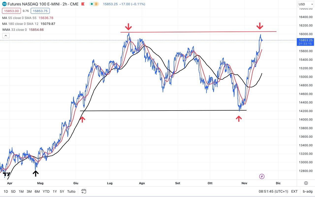 Potrebbe essere molto significativo il grafico del NASDAQ 100, che ieri ha raggiunto un potenziale DOPPIO MASSIMO con quello di LUGLIO (sulla soglia dei 16000 punti) ed è tornato leggermente indietro.